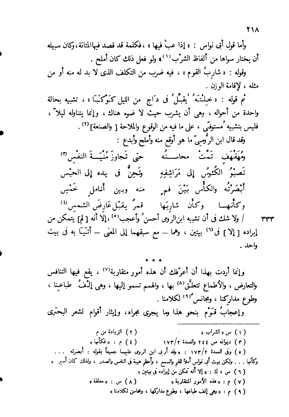 (1) س: " الشراب " (2) الزيادة من م (3) ديوانه ص 244 والعمدة 2 / 173 (4) م: " فكأنها " (5) وفى العمدة 2 / 173: " وقد أربى ابن الرومي عليهما جميعا بقوله: أبصرته ... وكأنها ... ولكن بيت أبى نواس أملا للفم والسمع، وأعظم هيبة في النفس والصدر، ولذلك كان أسير " (6) س، ك: " إلا أنه تمكن من إيراده في بيتين " (7) م: " هذه الامور المتقاربة " (8) س: " معلقة " (9) م: " وهى إلف طباعها، وطوع مداركها، ومحاسن لكلامنا " (*)