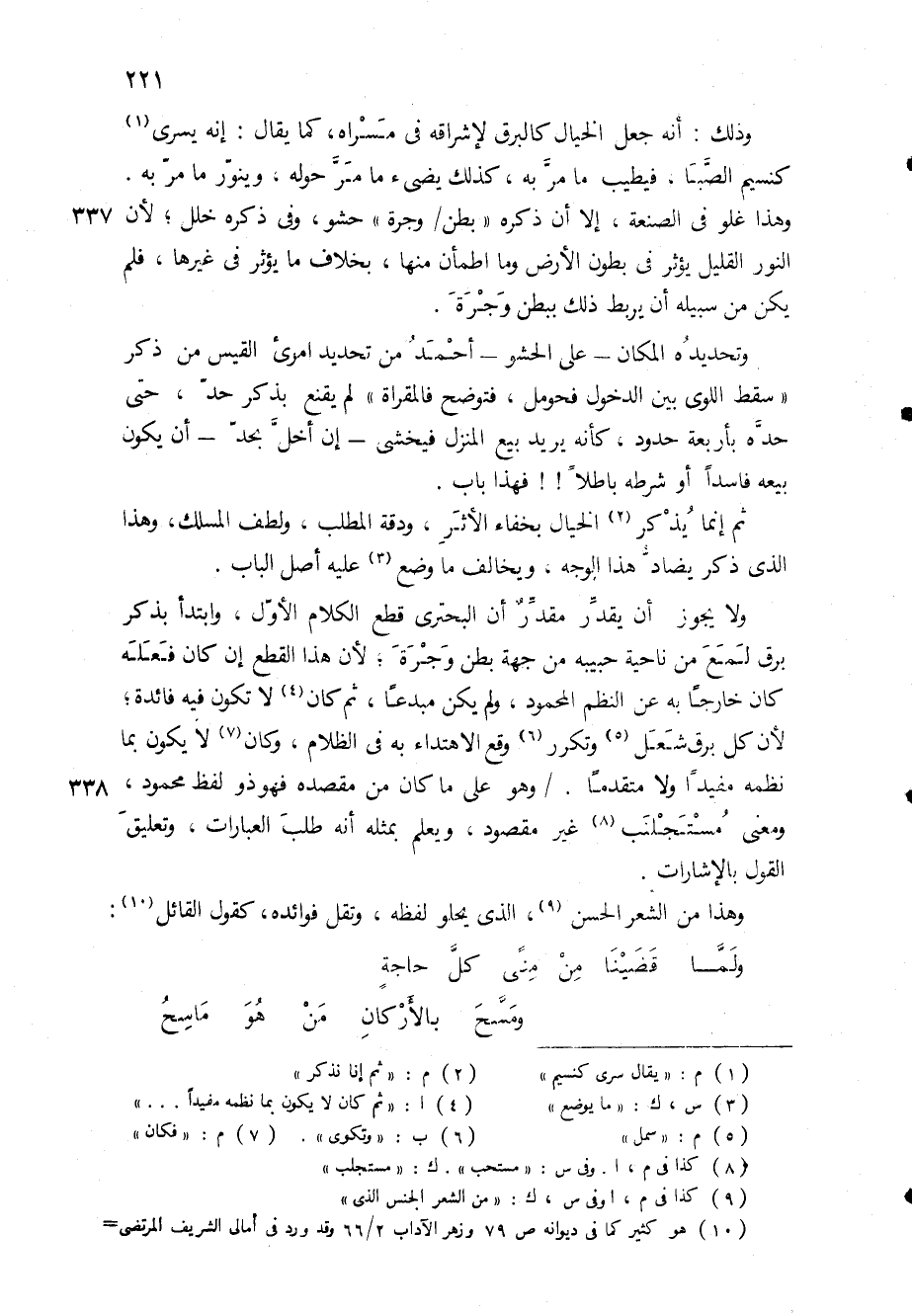 وهذا من الشعر الحسن (9) ، الذي يحلو لفظه، وتقل فوائده، كقول القائل (10) : ولما قضينا من مِنىً كُلَّ حاجةٍ * ومَسَّحَ بالاركان من هو ماسح