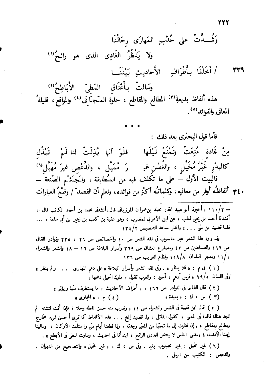 وشَدَّتْ على حُدْبِ المهاري رحالُنا * ولا ينظُرُ الغادي الذي هو رائحُ (1) / أخذنا بأطرافِ الأحاديثِ بيننا * وسالت بأعناقِ المِطيِّ الأباطحُ (2) هذه ألفاظ بديعة (3) المطالع والمقاطع، حلوة المجاني (4) والمواقع، قليلة المعاني والفوائد.
