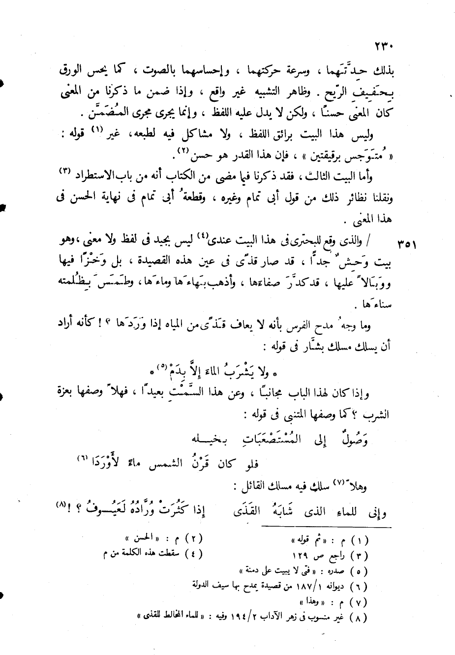 (1) م: " ثم قوله " (2) م: " الحسن " (3) راجع ص 129 (4) سقطت هذه الكملة من م (5) صدره: " فتى لا يبيت على دمنة " (6) ديوانه 1 / 187 من قصيدة يمدح بها سيف الدولة (7) م: " وهذا " (8) غير منسوب في زهر الآداب 2 / 194 وفيه: " للماء المخالط للقذى " (*)