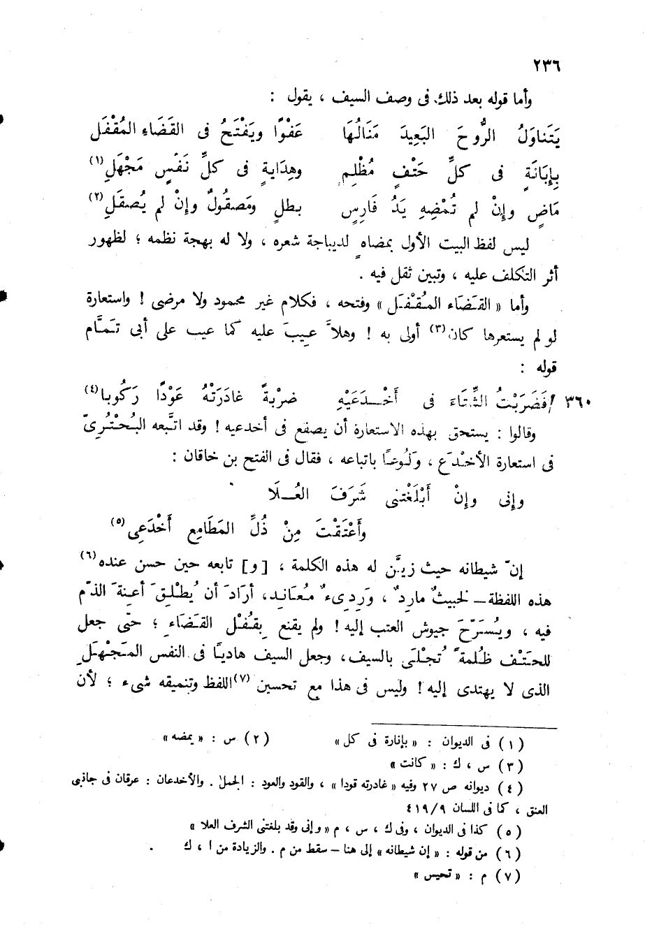 وأما القضاء المقفل " وفتحه، فكلام غير محمود ولا مرضي! واستعارة لو لم يستعرها كان (3) أولى به! وهلاَّ عيب عليه كما عيب على أبي تمام قوله: فضربت الشتاء في أخدعيه * ضربةً غادرته عُودا ركوبا (4) وقالوا: يستحق بهذه الإستعارة أن يصفع في أخدعيه! وقد اتبعه البحتري في استعارة الأخدع، ولوعاً باتباعه، فقال في الفتح بن خاقان: وإنى وإن أبلغتني شرف العلا * وأعتقتَ من ذلِّ المطامع أخدعي (5) إن شيطانه حيث زين له هذه الكلمة، [و] تابعه حين حسن عنده (6) هذه اللفظة - لخبيث ما رد، وردئ معاند، أراد أن يطلق أعنة الذم فيه، ويسرح جيوش العتب إليه! ولم يقنع بقفل القضاء، حتى جعل للحتف ظلمة تجلى بالسيف، وجعل السيف هادياً في النفس المجهل الذي لا يهتدي إليه! وليس في هذا مع تحسين (7) اللفظ وتنميقه شئ، لان
