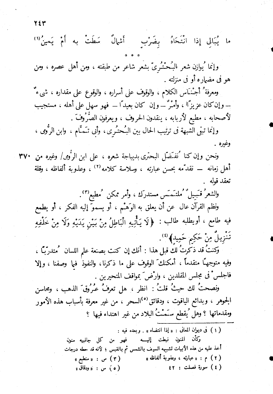 أخذ عليه من هذه الابيات تشبيهه السيف بالشمس ثم بالقبس، لانه قد حطه درجات (2) م: " عبارته، وعذوبة ألفاظه " (3) س: " منطبع " (4) سورة فصلت: 42 (5) س: " ودقاق " (*)