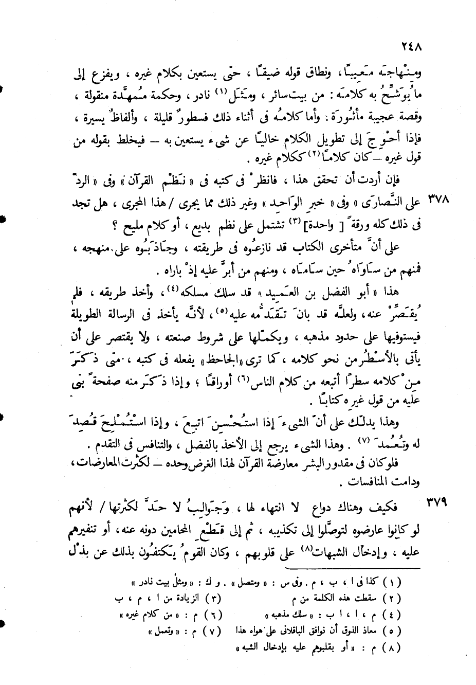 هذا " أبو الفضل بن العميد " قد سلك مسلكه (4) ، وأخذ طريقه، فلم يقصر عنه، ولعله قد بان تقدمه عليه (5) ، لأنه يأخذ في الرسالة الطويلة فيستوفيها على حدود مذهبه، ويكملها على شروط صنعته، ولا يقتصر على أن يأتي بالأسطر من نحو كلامه، كما ترى " الجاحظ " يفعله في كتبه، متى ذكر من كلامه سطراً أتبعه من كلام الناس (6) أوراقاً، وإذا ذكر منه صفحة بنى عليه من قول غيره كتاباً.