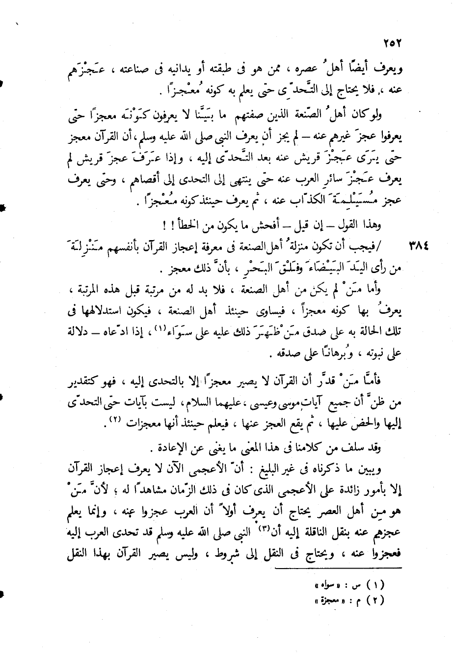 ولو كان أهل الصنعة الذين صفتهم ما بينا لا يعرفون كونه معجزاً حتى يعرفوا عجز غيرهم عنه - لم يجز أن يعرف النبي صلى الله عليه وسلم، أن القرآن معجز حتى يرى عجز قريش عنه بعد التحدي إليه، وإذا عرف عجز قريش لم يعرف عجز سائر العرب عنه حتى ينتهي إلى التحدي إلى أقصاهم، وحتى يعرف عجز مسيلمة الكذاب عنه، ثم يعرف حينئذ كونه معجزاً.