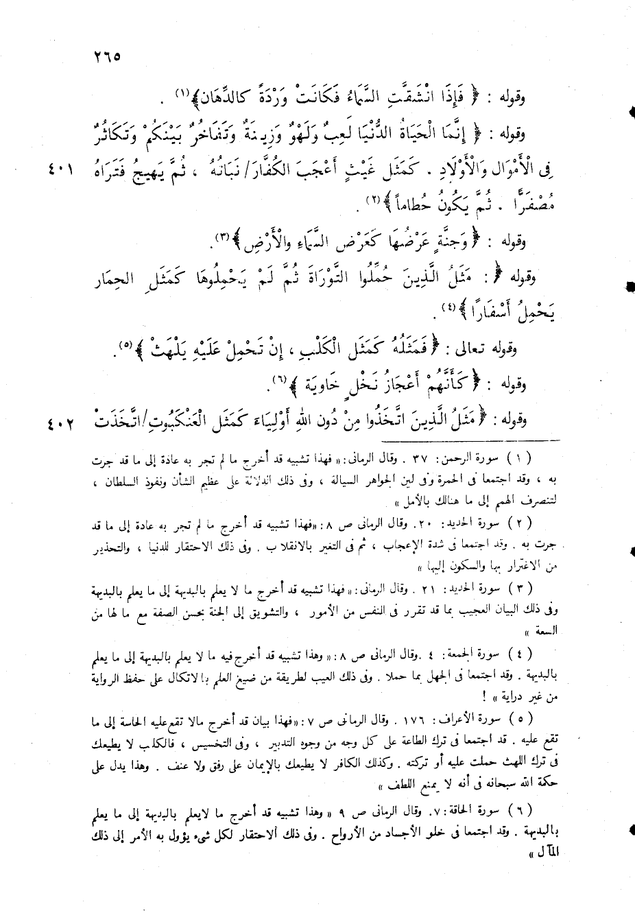 وقال الرماني: " فهذا تشبيه قد أخرج ما لا يعلم بالبديهة إلى ما يعلم بالبديهة وفى ذلك البيان العجيب بما قد تقرر في النفس من الامور، والتشويق إلى الجنة بحسن الصفة مع ما لها من السعة " (4) سورة الجمعة: 4.