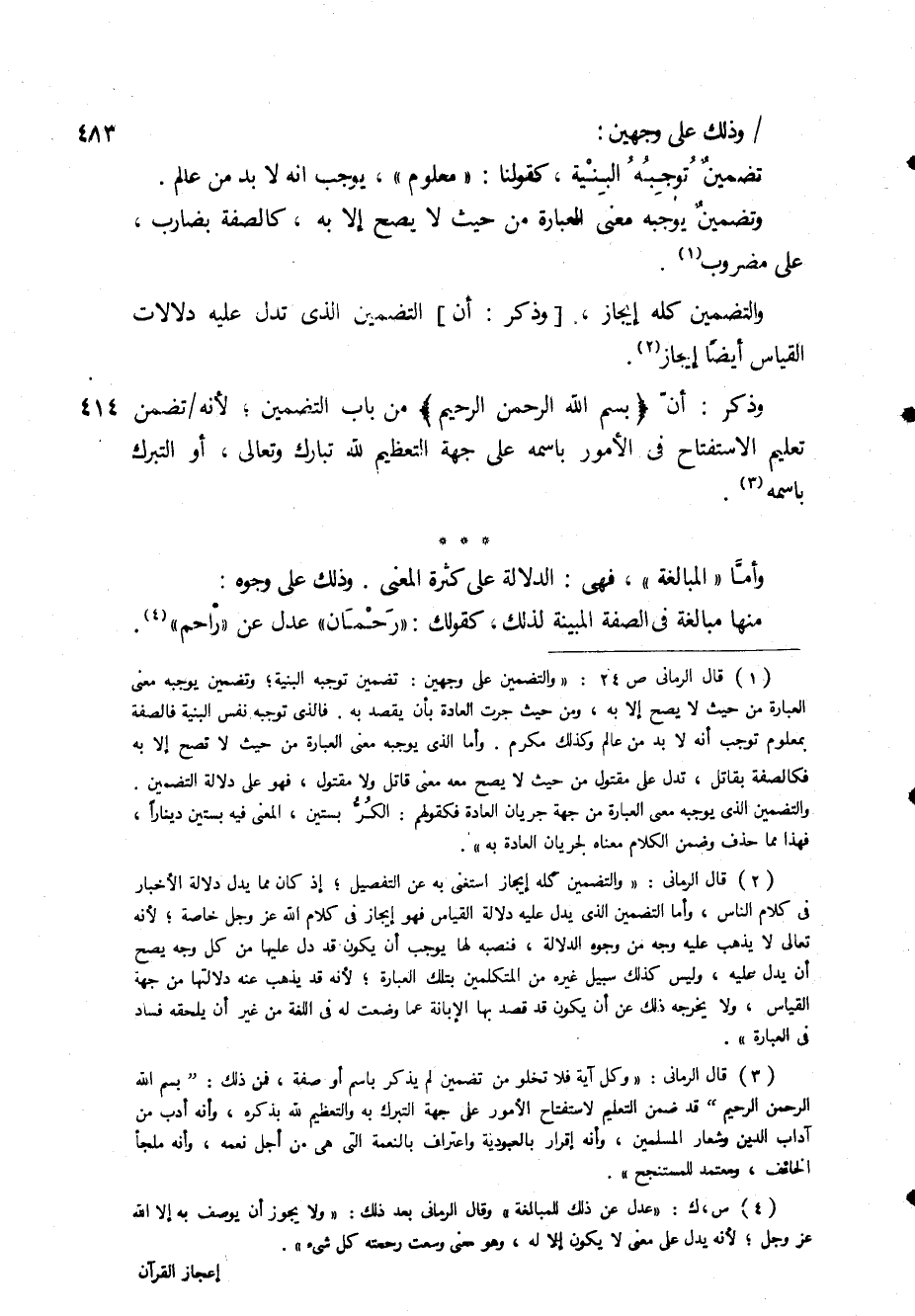 (3) قال الرماني: " وكل آية فلا تخلو من تضمين لم يذكر باسم أو صفة، فمن ذلك: " بسم الله الرحمن الرحيم " قد ضمن التعليم لاستفتاح الامور على جهة التبرك به والتعظيم لله بذكره، وأنه أدب من آداب الدين وشعار المسلمين، وأنه إقرار بالعبودية واعتراف بالنعمة التى هي من أجل نعمه، وأنه ملجأ الخائف، ومعتمد للمستنجح ".