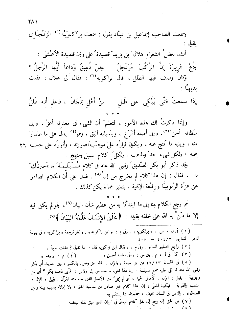 وسمعت الصاحب إسماعيل بن عباد يقول: سمعت براكويه (1) الزنجاني يقول: أنشد بعض الشعراء هلال بن يزيد قصيدة على وزن قصيدة الأعشى: وَدِّعْ هريرةَ إن الركبَ مرتحلُ * وهل تطيقُ وداعاً أيها الرجلُ؟ وكان وصف فيها الطلل، قال براكويه (2) : فقال لي هلال: فقلت بديهاً: إذا سمعت فتى يبكي على طلل * من أهل زَنْجانَ، فاعلم أنه طلل * * * وإنما ذكرت لك هذه الأمور، لتعلم أن الشئ في معدنه أعز، وإلى مظانه أحن (3) ، وإلى أصله أنزع، وبأسبابه أليق، وهو (4) يدل على ما صدر منه، وينبه ما انتج عنه، ويكون قراره على موجب / صورته، وأنواره على حسب محله، ولكل شئ حد ومذهب، ولكل كلام سبيل ومنهج.