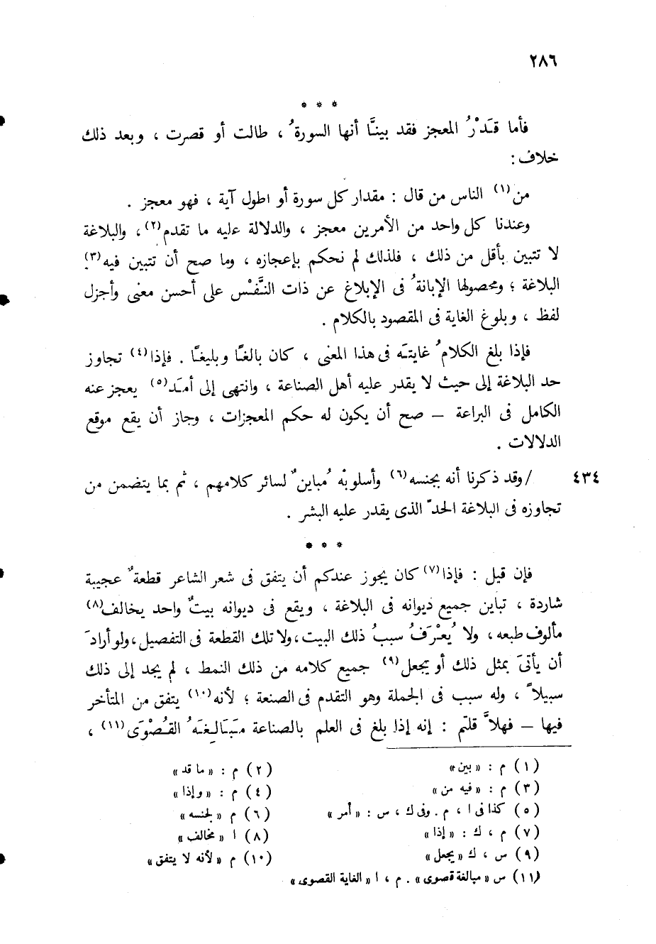 * * * فأما قدر المعجز فقد بينا أنها السورة، طالت أو قصرت، وبعد ذلك خلاف: من (1) الناس من قال: مقدار كل سورة أو أطول أية، فهو معجز.