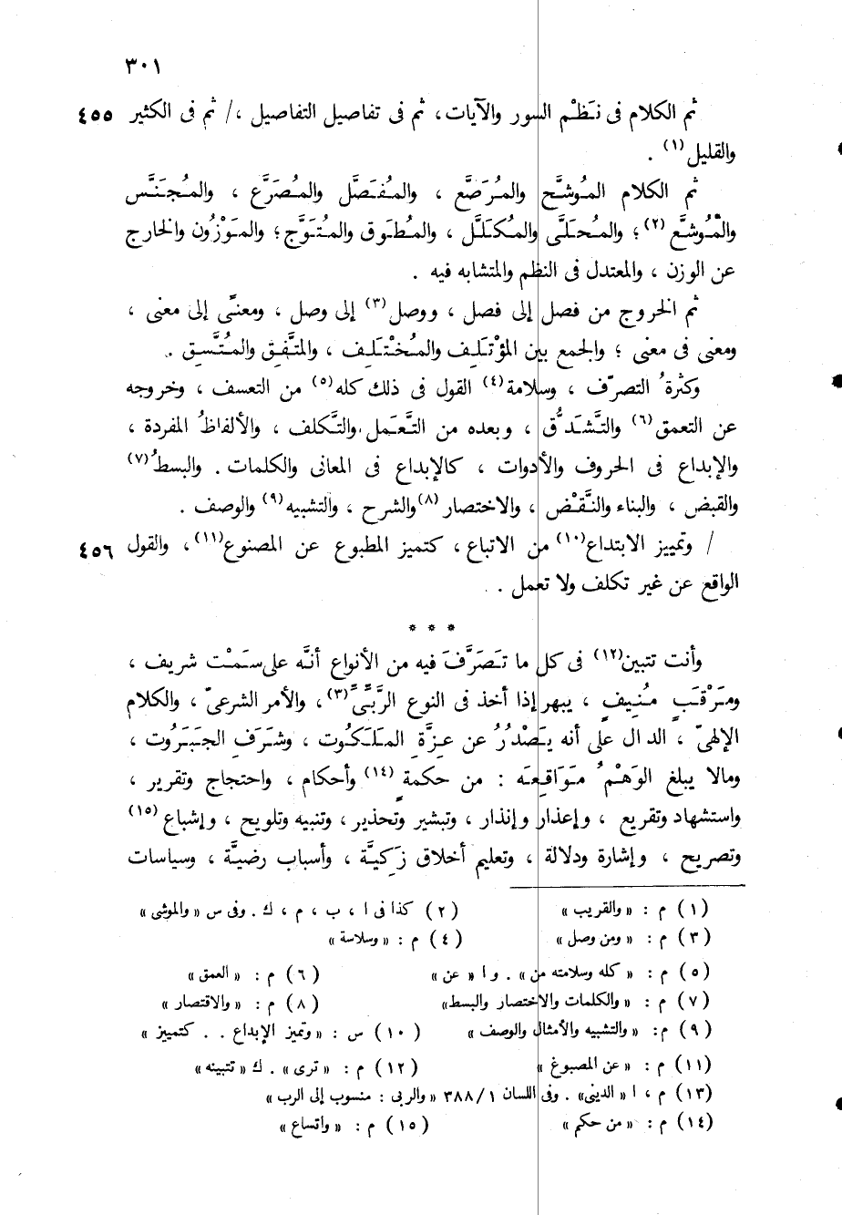 ثم الكلام الموشَّح والمرصَّع، والمفصّل والمصرّع، والمجنّس والموشع (2) ، والمحلّى والمكلّل، والمطوّق والمتوّج، والموزون والخارج عن الوزن، والمعتدل في النظم والمتشابه فيه.