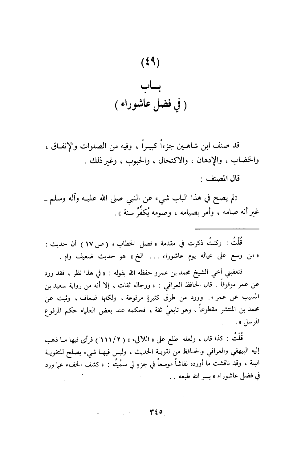 قد صنف ابْن شاهين جُزْءا كَبِيرا، وَفِيه من الصَّلَوَات والإنفاق، والخضاب، والإدهان، والاكتحال، والحبوب، وَغير ذَلِك. قَالَ المُصَنّف: " لم يَصح فِي هَذَا الْبَاب شَيْء عَن النَّبِي صلى الله عَلَيْهِ وَسلم - غير أَنه صَامَهُ، وَأمر بصيامه، وصومه يكفر سنة ".