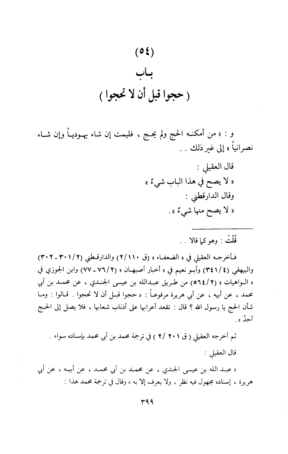 و: " من أمكنه الْحَج وَلم يحجّ، فليميت إِن شَاءَ الله يَهُودِيّا وَإِن شَاءَ نَصْرَانِيّا " إِلَى غير ذَلِك ... قَالَ الْعقيلِيّ: " لَا يَصح فِي هَذَا الْبَاب شَيْء ". وَقَالَ الدَّارَقُطْنِيّ: " لَا يَصح مِنْهَا شَيْء ".