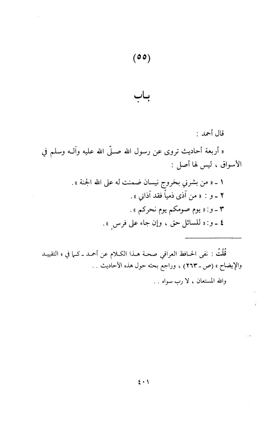 قَالَ أَحْمد: " أَرْبَعَة أَحَادِيث تروى عَن رَسُول الله صلى الله عَلَيْهِ وَسلم فِي الْأَسْوَاق، لَيْسَ لَهَا أصل: 1 - " من بشرني بِخُرُوج نيسان ضمنت لَهُ على الله الْجنَّة ". 2 - و: " من آذَى ذِمِّيا فقد آذَانِي ". 3 - و: " يَوْم صومكم يَوْم نحركم ". 4 - و: للسَّائِل حق، وَإِن جَاءَ على فرس ".