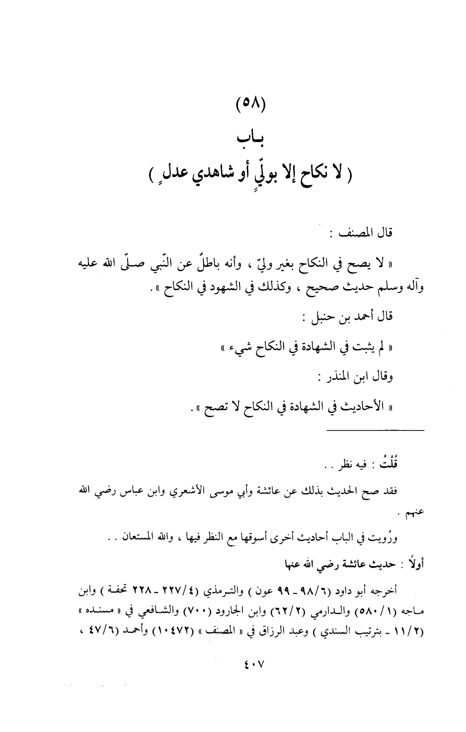 قَالَ المُصَنّف: " لَا يَصح فِي النِّكَاح بِغَيْر ولي، وَأَنه بَاطِل عَن النَّبِي صلى الله عَلَيْهِ وَسلم حَدِيث صَحِيح، وَكَذَلِكَ فِي الشُّهُود فِي النِّكَاح ". قَالَ أَحْمد بن حَنْبَل: " لم يثبت فِي الشَّهَادَة فِي النِّكَاح شَيْء ". وَقَالَ ابْن الْمُنْذر: " الْأَحَادِيث فِي الشَّهَادَة فِي النِّكَاح لَا تصح ".