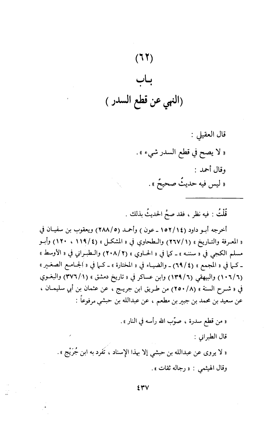 قَالَ الْعقيلِيّ: " لَا يَصح فِي قطع السدر شَيْء ". وَقَالَ أَحْمد: " لَيْسَ فِيهِ حَدِيث صَحِيح ".