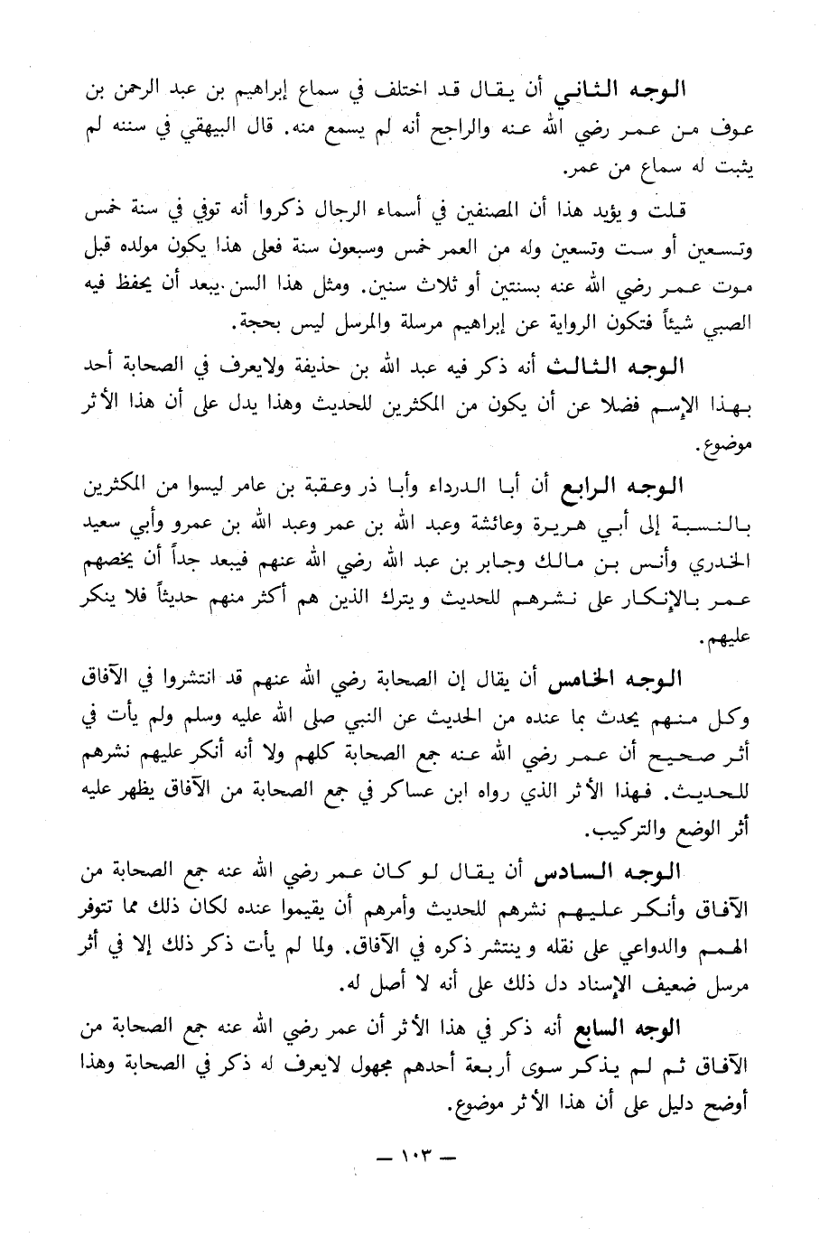 الوجه السادس أن يقال لو كان عمر رضي الله عنه جمع الصحابة من الآفاق وأنكر عليهم نشرهم للحديث وأمرهم أن يقيموا عنده لكان ذلك مما تتوفر الهمم والدواعي على نقله وينتشر ذكره في الآفاق. ولما لم يأت ذكر ذلك إلا في أثر مرسل ضعيف الإِسناد دل ذلك على أنه لا أصل له.