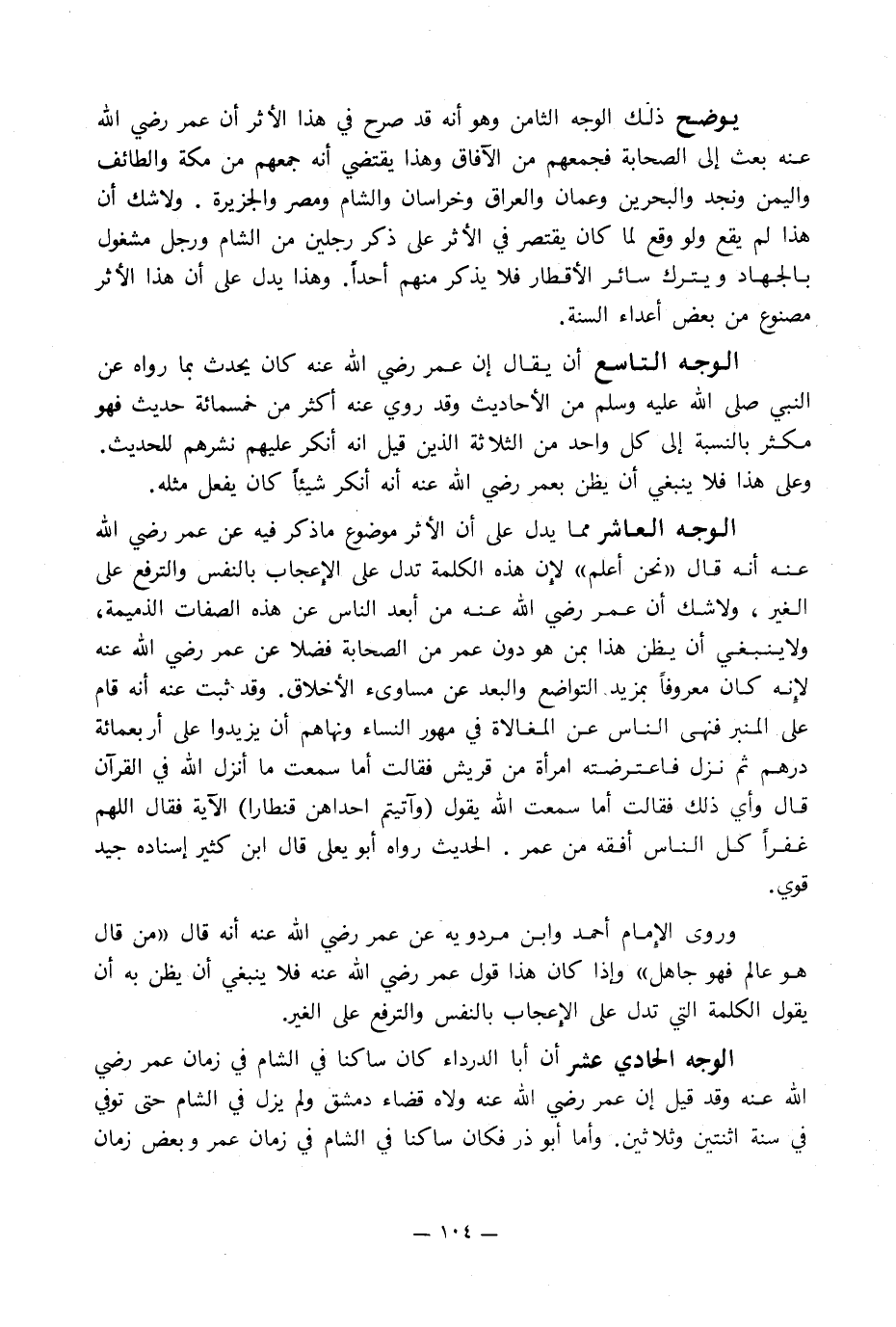 الوجه العاشر مما يدل على أن الأثر موضوع ما ذكر فيه عن عمر رضي الله عنه أنه قال «نحن أعلم» لأن هذه الكلمة تدل على الإِعجاب بالنفس والترفع على الغير, ولا شك أن عمر رضي الله عنه من أبعد الناس عن هذه الصفات الذميمة, ولا ينبغي أن يظن هذا بمن هو دون عمر من الصحابة فضلا عن عمر رضي الله عنه لأنه كان معروفاً بمزيد التواضع والبعد عن مساوئ الأخلاق. وقد ثبت عنه أنه قام على المنبر فنهى الناس عن المغالاة في مهور النساء ونهاهم أن يزيدوا على أربعمائة درهم ثم نزل فاعترضته امرأة من قريش فقالت أما سمعت ما أنزل الله في القرآن قال وأي ذلك فقالت أما سمعت الله يقول (وآتيتم إحداهن قنطارا) الآية فقال اللهم غفرا كل الناس أفقه من عمر. الحديث رواه أبو يعلى قال ابن كثير إسناده جيد قوي.