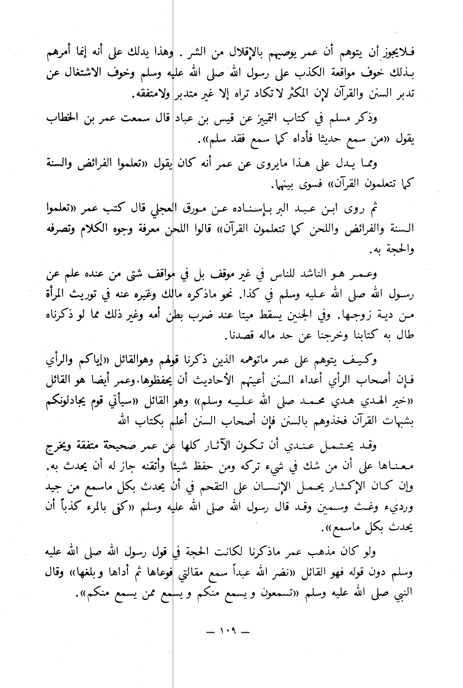 وكيف يتوهم على عمر ما توهمه الذين ذكرنا قولهم وهو القائل «إياكم والرأي فإِن أصحاب الرأي أعداء السنن أعيتهم الأحاديث أن يحفظوها. وعمر أيضا هو القائل «خير الهدي هدي محمد صلى الله عليه وسلم» وهو القائل «سيأتي قوم يجادلونكم بشبهات القرآن فخذوهم بالسنن فإِن أصحاب السنن أعلم بكتاب الله».