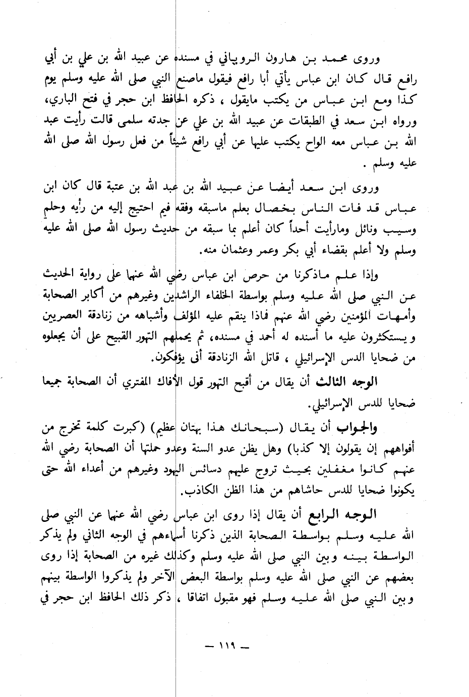 الوجه الرابع أن يقال إذا روى ابن عباس رضي الله عنهما عن النبي صلى الله عليه وسلم بواسطة الصحابة الذين ذكرنا أسماءهم في الوجه الثاني ولم يذكر الواسطة بينه وبين النبي صلى الله عليه وسلم وكذلك غيره من الصحابة إذا روى بعضهم عن النبي صلى الله عليه وسلم بواسطة البعض الآخر ولم يذكروا الواسطة بينهم وبين النبي صلى الله عليه وسلم فهو مقبول اتفاقا, ذكر ذلك الحافظ ابن حجر في