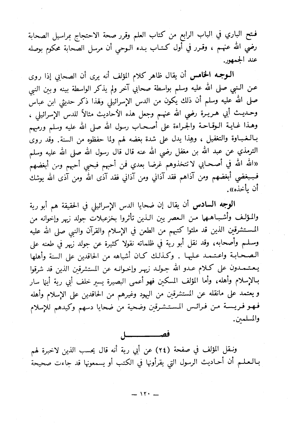 الوجه الخامس أن يقال ظاهر كلام المؤلف أنه يرى أن الصحابي إذا روى عن النبي صلى الله عليه وسلم بواسطة صحابي آخر ولم يذكر الواسطة بينه وبين النبي صلى الله عليه وسلم أن ذلك يكون من الدس الإِسرائيلي ولهذا ذكر حديثي ابن عباس وحديث أبي هريرة رضي الله عنهم وجعل هذه الأحاديث مثالاً للدس الإِسرائيلي, وهذا غاية الوقاحة والجراءة على أصحاب رسول الله صلى الله عليه وسلم ورميهم بالغباوة والتغفيل, وهِذا يدل على شدة بغضه لهم ولما حفظوه من السنة. وقد روى الترمذي عن عبد الله بن مغفل رضي الله عنه قال قال رسول الله صلى الله عليه وسلم «الله الله في أصحابي لا تتخذوهم غرضا بعدي فمن أحبهم فبحبي أحبهم ومن أبغضهم فببغضي أبغضهم ومن آذاهم فقد آذاني ومن آذاني فقد آذى الله ومن آذى الله يوشك أن يأخذه».