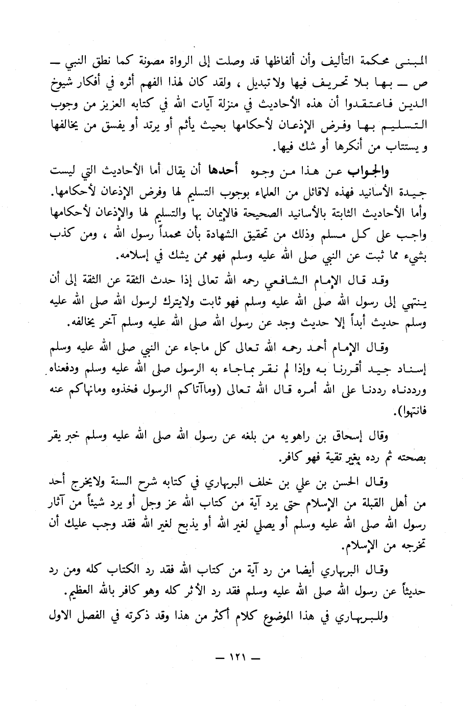 والجواب عن هذا من وجوه أحدها أن يقال أما الأحاديث التي ليست جيدة الأسانيد فهذه لا قائل من العلماء بوجوب التسليم لها وفرض الإِذعان لأحكامها. وأما الأحاديث الثابتة بالأسانيد الصحيحة فالإِيمان بها والتسليم لها والإِذعان لأحكامها واجب على كل مسلم وذلك من تحقيق الشهادة بأن محمداً رسول الله, ومن كذب بشيء مما ثبت عن النبي صلى الله عليه وسلم فهو ممن يشك في إسلامه.