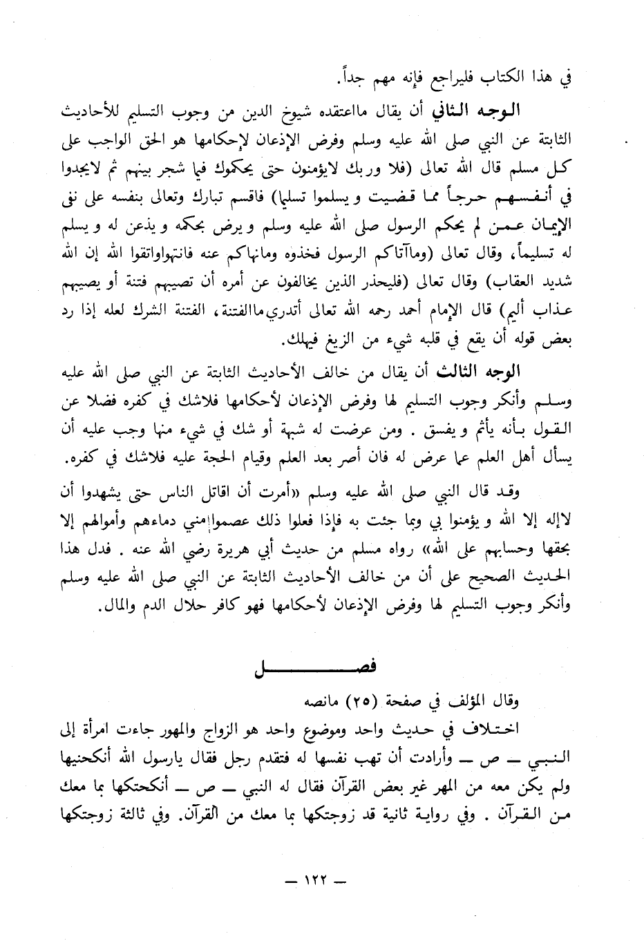 الوجه الثاني أن يقال ما اعتقده شيوخ الدين من وجوب التسليم للأحاديث الثابتة عن النبي صلى الله عليه وسلم وفرض الإِذعان لإِحكامها هو الحق الواجب على كل مسلم قال الله تعالى (فلا وربك لا يؤمنون حتى يحكموك فيما شجر بينهم ثم لا يجدوا في أنفسهم حرجاً مما قضيت ويسلموا تسليما) فأقسم تبارك وتعالى بنفسه على نفي الإِيمان عمن لم يحكم الرسول صلى الله عليه وسلم ويرض بحكمه ويذعن له ويسلم له تسليماً, وقال تعالى (وما آتاكم الرسول فخذوه وما نهاكم عنه فانتهوا واتقوا الله إن الله شديد العقاب) وقال تعالى (فليحذر الذين يخالفون عن أمره أن تصيبهم فتنة أو تصيبهم عذاب أليم) قال الإِمام أحمد رحمه الله تعالى أتدري ما الفتنة, الفتنة الشرك لعله إذا رد بعض قوله أن يقع في قلبه شيء من الزيغ فيهلك.