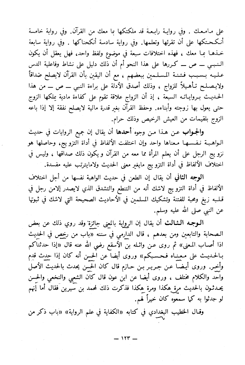 الوجه الثالث أن يقال إن الرواية بالمعنى جائزة وقد روي ذلك عن بعض الصحابة والتابعين ومن بعدهم, قال الدارمي في سننه «باب من رخص في الحديث إذا أصاب المعنى» ثم روى عن واثلة بن الأسقع رضي الله عنه قال «إذا حدثناكم بالحديث على معناه فحسبكم» وروى أيضا عن الحسن أنه كان إذا حدث قدم وأخر. وروى أيضا عن جرير بن حازم قال كان الحسن يحدث بالحديث الأصل واحد والكلام مختلف, وروى أيضا عن ابن عون قال كان الشعبي والنخعي والحسن يحدثون بالحديث مرة هكذا ومرة هكذا فذكرت ذلك لمحمد بن سيرين فقال أما إنهم لو حدثوا به كما سمعوا كان خيراً لهم.