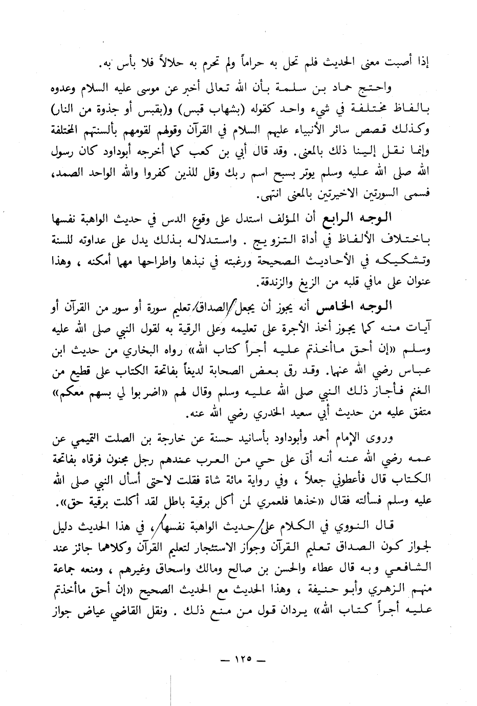 الوجه الخامس أنه يجوز أن يجعل الصداق تعليم سورة أو سور من القرآن أو آيات منه كما يجوز أخذ الأجرة على تعليمه وعلى الرقية به لقول النبي صلى الله عليه وسلم «إن أحق ما أخذتم عليه أجراً كتاب الله» رواه البخاري من حديث ابن عباس رضي الله عنهما. وقد رقى بعض الصحابة لديغاً بفاتحة الكتاب على قطيع من الغنم فأجاز ذلك النبي صلى الله عليه وسلم وقال لهم «اضربوا لي بسهم معكم» متفق عليه من حديث أبي سعيد الخدري رضي الله عنه.