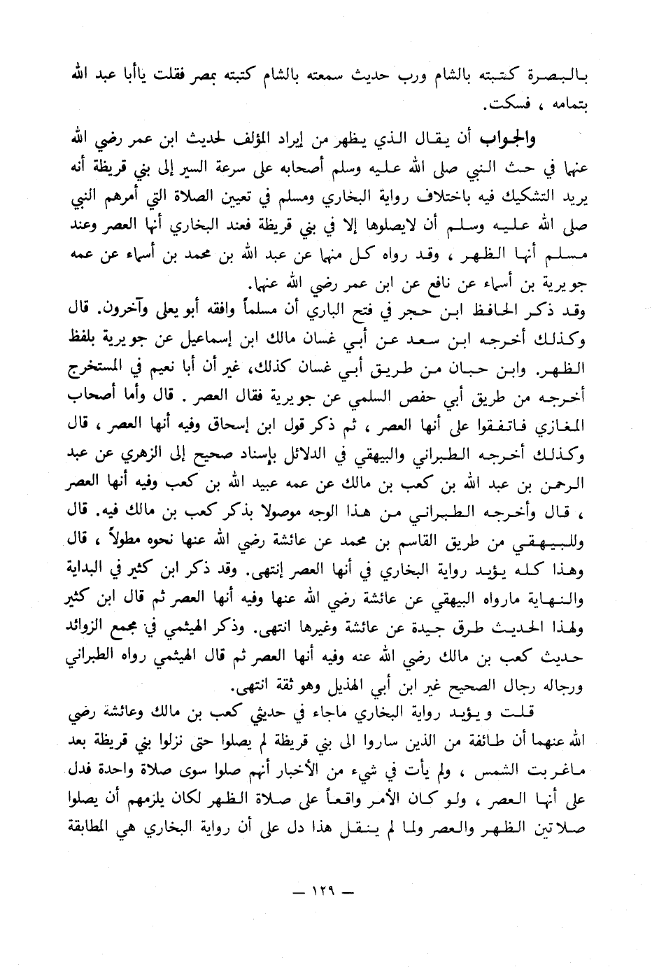 وقد ذكر الحافظ ابن حجر في فتح الباري أن مسلماً وافقه أبو يعلى وآخرون. قال وكذلك أخرجه ابن سعد عن أبي غسان مالك بن إسماعيل عن جويرية بلفظ الظهر. وابن حبان من طريق أبي غسان كذلك, غير أن أبا نعيم في المستخرج أخرجه من طريق أبي حفص السلمي عن جويرية فقال العصر. قال وأما أصحاب المغازي فاتفقوا على أنها العصر, ثم ذكر قول ابن إسحاق وفيه أنها العصر, قال وكذلك أخرجه الطبراني والبيهقي في الدلائل بإِسناد صحيح إلى الزهري عن عبد الرحمن بن عبد الله بن كعب بن مالك عن عمه عبيد الله بن كعب وفيه أنها العصر, قال وأخرجه الطبراني من هذا الوجه موصولا بذكر كعب بن مالك فيه. قال وللبيهقي من طريق القاسم بن محمد عن عائشة رضي الله عنها نحوه مطولاً, قال وهذا كله يؤيد رواية البخاري في أنها العصر انتهى. وقد ذكر ابن كثير في البداية والنهاية ما رواه البيهقي عن عائشة رضي الله عنها وفيه أنها العصر ثم قال ابن كثير ولهذا الحديث طرق جيدة عن عائشة وغيرها انتهى. وذكر الهيثمي في مجمع الزوائد حديث كعب بن مالك رضي الله عنه وفيه أنها العصر ثم قال الهيثمي رواه الطبراني ورجاله رجال الصحيح غير ابن أبي الهذيل وهو ثقة انتهى.