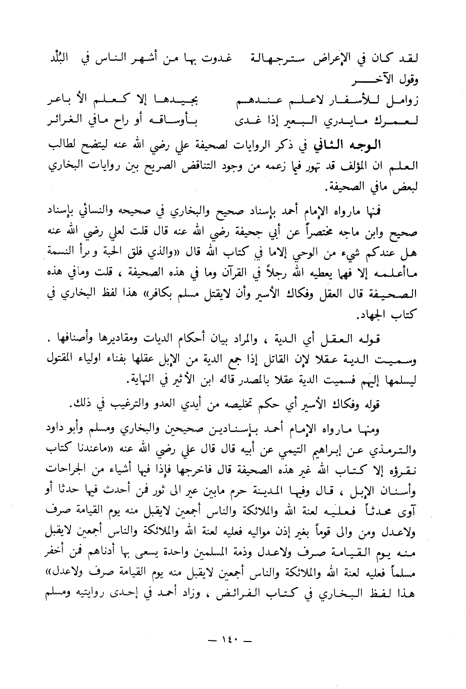 فمنها ما رواه الإِمام أحمد بإِسناد صحيح والبخاري في صحيحه والنسائي بإِسناد صحيح وابن ماجه مختصراً عن أبي جحيفة رضي الله عنه قال قلت لعلي رضي الله عنه هل عندكم شيء من الوحي إلا ما في كتاب الله قال «والذي فلق الحبة وبرأ النسمة ما أعلمه إلا فهما يعطيه الله رجلاً في القرآن وما في هذه الصحيفة, قلت وما في هذه الصحيفة قال العقل وفكاك الأسير وأن لا يقتل مسلم بكافر» هذا لفظ البخاري في كتاب الجهاد.