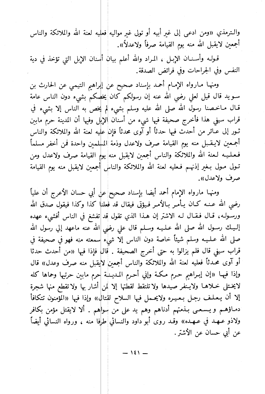 ومنها ما رواه الإِمام أحمد بإِسناد صحيح عن إبراهيم التيمي عن الحارث بن سويد قال قيل لعلي رضي الله عنه إن رسولكم كان يخصكم بشيء دون الناس عامة قال ما خصنا رسول الله صلى الله عليه وسلم بشيء لم يخص به الناس إلا بشيء في قراب سيفي هذا فأخرج صحيفة فيها شيء من أسنان الإِبل وفيها أن المدينة حرم ما بين ثور إلى عائر من أحدث فيها حدثاً أو آوى محدثاً فإِن عليه لعنة الله والملائكة والناس أجمعين لا يقبل منه يوم القيامة صرف ولا عدل وذمة المسلمين واحدة فمن أخفر مسلماً فعليه لعنة الله والملائكة والناس أجمعين لا يقبل منه يوم القيامة صرف ولا عدل ومن تولى مولى بغير إذنهم فعليه لعنة الله والملائكة والناس أجمعين لا يقبل منه يوم القيامة صرف ولا عدل».