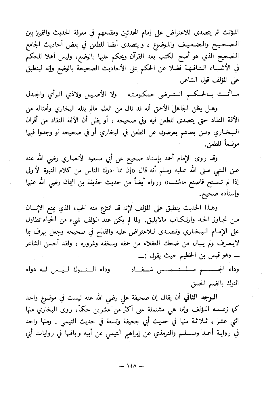 وهذا الحديث ينطبق على المؤلف لأنه قد انتزع منه الحياء الذي يمنع الإِنسان من تجاوز الحد وارتكاب ما لا يليق. ولما لم يكن عند المؤلف شيء من الحياء تطاول على الإِمام البخاري وتصدى للاعتراض عليه والقدح في صحيحه وجعل يهرف بما لا يعرف ولم يبال من ضحك العقلاء من حمقه وسخفه وغروره, ولقد أحسن الشاعر - وهو قيس بن الخطيم حيث يقول: -