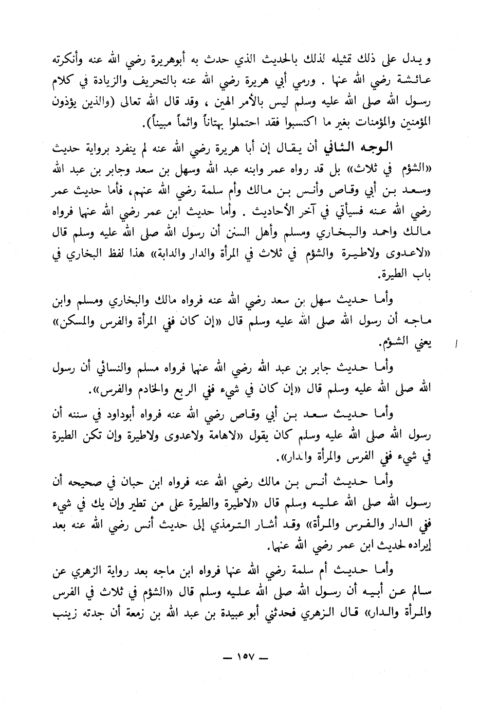 الوجه الثاني أن يقال إن أبا هريرة رضي الله عنه لم ينفرد برواية حديث «الشؤم في ثلاث» بل قد رواه عمر وابنه عبد الله وسهل بن سعد وجابر بن عبد الله وسعد بن أبي وقاص وأنس بن مالك وأم سلمة رضي الله عنهم, فأما حديث عمر رضي الله عنه فسيأتي في آخر الأحاديث. وأما حديث ابن عمر رضي الله عنهما فرواه مالك وأحمد والبخاري ومسلم وأهل السنن أن رسول الله صلى الله عليه وسلم قال «لا عدوى ولا طيرة والشؤم في ثلاث في المرأة والدار والدابة» هذا لفظ البخاري في باب الطيرة.