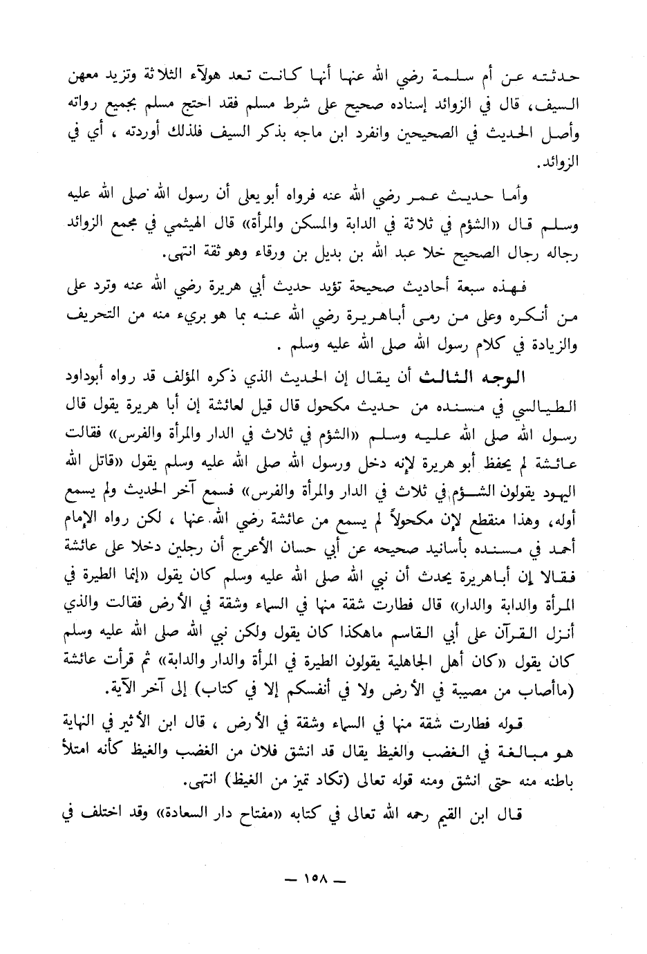 الوجه الثالث أن يقال إن الحديث الذي ذكره المؤلف قد رواه أبو داود الطيالسي في مسنده من حديث مكحول قال قيل لعائشة إن أبا هريرة يقول قال رسول الله صلى الله عليه وسلم «الشؤم في ثلاث في الدار والمرأة والفرس» فقالت عائشة لم يحفظ أبو هريرة لأنه دخل ورسول الله صلى الله عليه وسلم يقول «قاتل الله اليهود يقولون الشؤم في ثلاث في الدار والمرأة والفرس» فسمع آخر الحديث ولم يسمع أوله, وهذا منقطع لأن مكحولاً لم يسمع من عائشة رضي الله عنها, لكن رواه الإِمام أحمد في مسنده بأسانيد صحيحة عن أبي حسان الأعرج أن رجلين دخلا على عائشة فقالا إن أبا هريرة يحدث أن نبي الله صلى الله عليه وسلم كان يقول «إنما الطيرة في المرأة والدابة والدار» قال فطارت شقة منها في السماء وشقة في الأرض فقالت والذي أنزل القرآن على أبي القاسم ما هكذا كان يقول ولكن نبي الله صلى الله عليه وسلم كان يقول «كان أهل الجاهلية يقولون الطيرة في المرأة والدار والدابة» ثم قرأت عائشة (ما أصاب من مصيبة في الأرض ولا في أنفسكم إلا في كتاب) إلى آخر الآية.