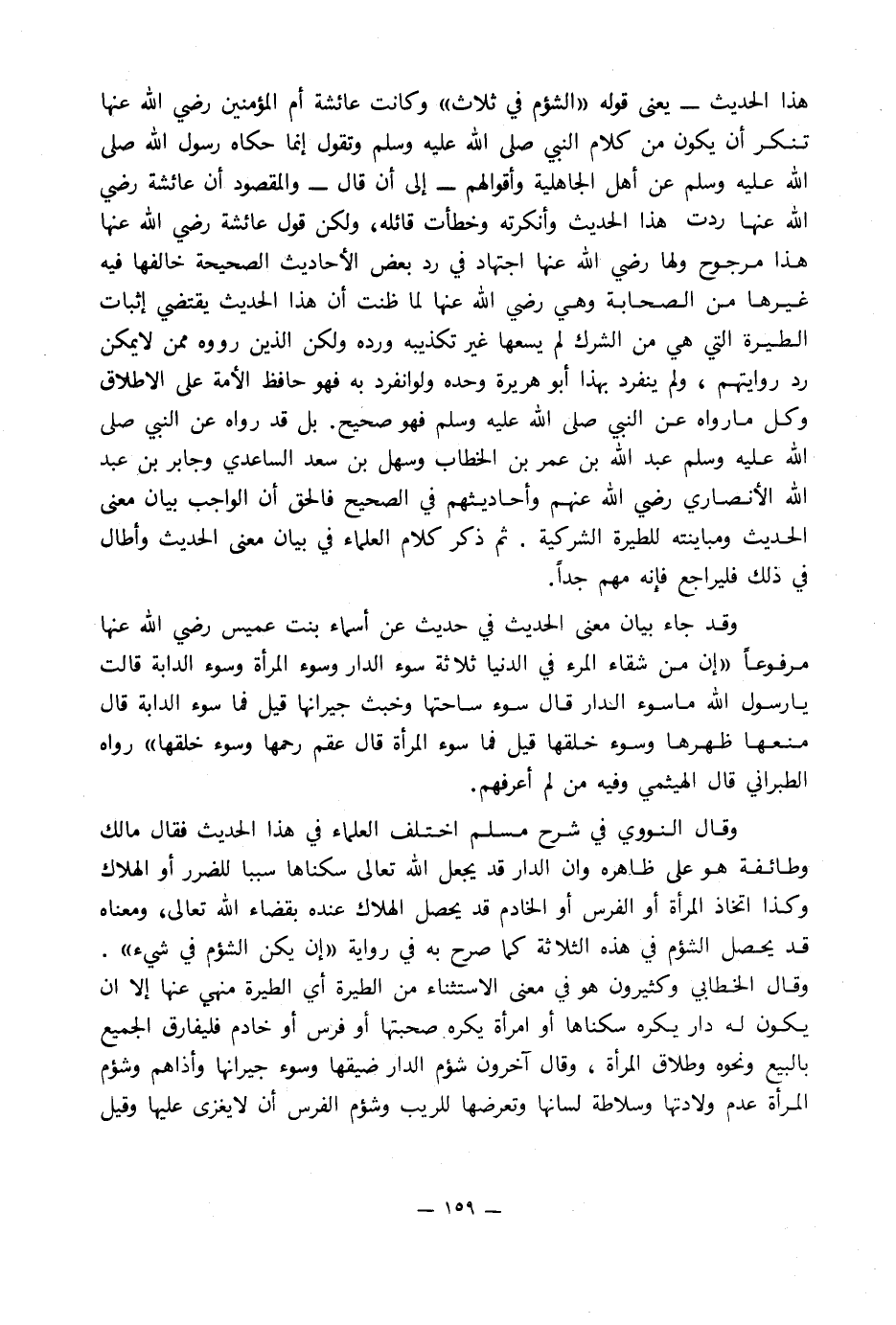 هذا الحديث - يعني قوله «الشؤم في ثلاث» وكانت عائشة أم المؤمنين رضي الله عنها تنكر أن يكون من كلام النبي صلى الله عليه وسلم وتقول إنما حكاه رسول الله صلى الله عليه وسلم عن أهل الجاهلية وأقوالهم - إلى أن قال - والمقصود أن عائشة رضي الله عنها ردت هذا الحديث وأنكرته وخطأت قائله, ولكن قول عائشة رضي الله عنها هذا مرجوح ولها رضي الله عنها اجتهاد في رد بعض الأحاديث الصحيحة خالفها فيه غيرها من الصحابة وهي رضي الله عنها لما ظنت أن هذا الحديث يقتضي إثبات الطيرة التي هي من الشرك لم يسعها غير تكذيبه ورده ولكن الذين رووه ممن لا يمكن رد روايتهم, ولم ينفرد بهذا أبو هريرة وحده ولو انفرد به فهو حافظ الأمة على الإطلاق وكل ما رواه عن النبي صلى الله عليه وسلم فهو صحيح. بل قد رواه عن النبي صلى الله عليه وسلم عبد الله بن عمر بن الخطاب وسهل بن سعد الساعدي وجابر بن عبد الله الأنصاري رضي الله عنهم وأحاديثهم في الصحيح فالحق أن الواجب بيان معنى الحديث ومباينته للطيرة الشركية. ثم ذكر كلام العلماء في بيان معنى الحديث وأطال في ذلك فليراجع فإِنه مهم جداً.