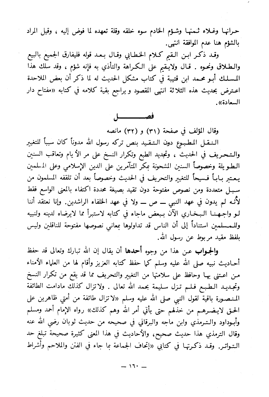 والجواب عن هذا من وجوه أحدها أن يقال إن الله تبارك وتعالى قد حفظ أحاديث نبيه صلى الله عليه وسلم كما حفظ كتابه العزيز وأقام لها من العلماء الأمناء من اعتنى بها وحافظ على سلامتها من التغيير والتحريف مما قد يقع من تكرار النسخ وتجديد الطبع فلم تزل سليمة بحمد الله تعالى. ولا تزال كذلك ما دامت الطائفة المنصورة باقية لقول النبي صلى الله عليه وسلم «لا تزال طائفة من أمتي ظاهرين على الحق لا يضرهم من خذلهم حتى يأتي أمر الله وهم كذلك» رواه الإِمام أحمد ومسلم وأبو داود والترمذي وابن ماجه والبرقاني في صحيحه من حديث ثوبان رضي الله عنه وقال الترمذي هذا حديث صحيح, والأحاديث في هذا المعنى كثيرة صحيحة تبلغ حد التواتر. وقد ذكرتها في كتابي «إتحاف الجماعة بما جاء في الفتن والملاحم وأشراط
