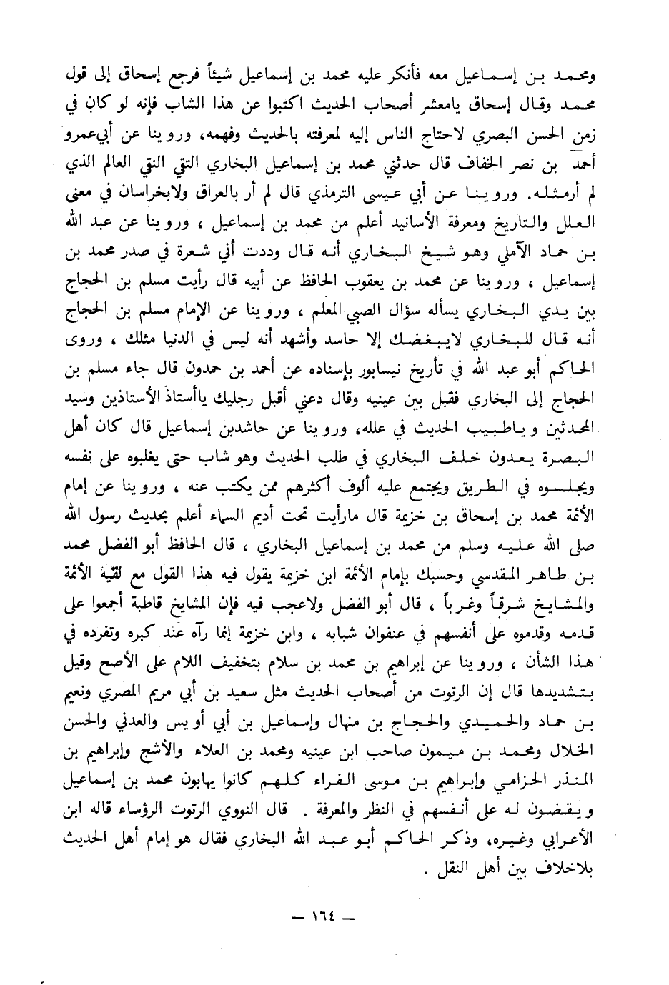 ومحمد بن إسماعيل معه فأنكر عليه محمد بن إسماعيل شيئاً فرجع إسحاق إلى قول محمد وقال إسحاق يا معشر أصحاب الحديث اكتبوا عن هذا الشاب فإِنه لو كان في زمن الحسن البصري لاحتاج الناس إليه لمعرفته بالحديث وفهمه, وروينا عن أبي عمرو أحمد بن نصر الخفاف قال حدثني محمد بن إسماعيل البخاري التقي النقي العالم الذي لم أر مثله.