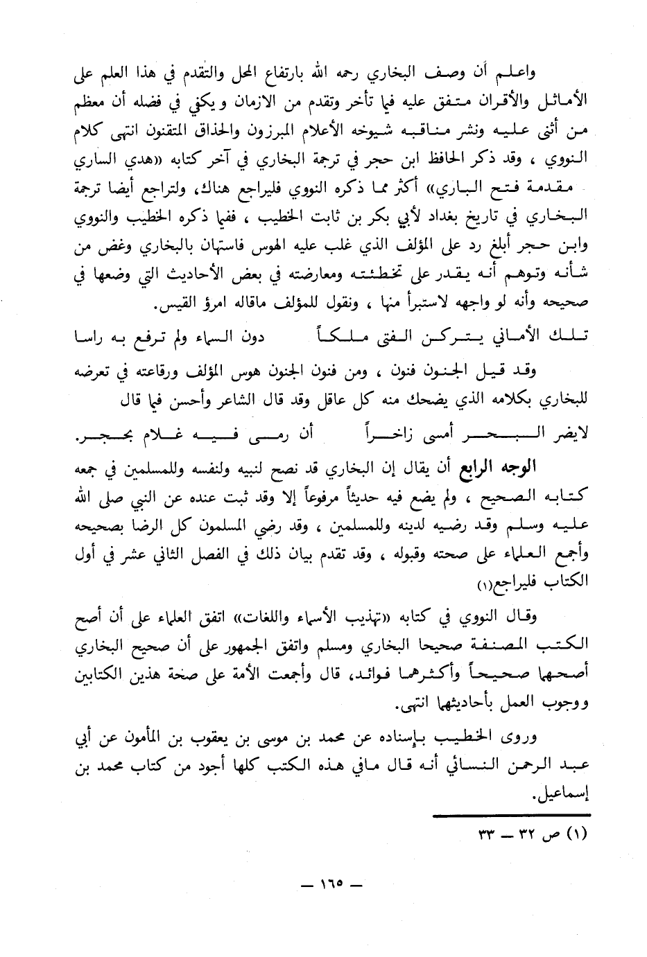 واعلم أن وصف البخاري رحمه الله بارتفاع المحل والتقدم في هذا العلم على الأماثل والأقران متفق عليه فيما تأخر وتقدم من الأزمان ويكفي في فضله أن معظم من أثنى عليه ونشر مناقبه شيوخه الأعلام المبرزون والحذاق المتقنون انتهى كلام النووي, وقد ذكر الحافظ ابن حجر في ترجمة البخاري في آخر كتابه «هدي الساري مقدمة فتح الباري» أكثر مما ذكره النووي فليراجع هناك, ولتراجع أيضا ترجمة البخاري في تاريخ بغداد لأبي بكر بن ثابت الخطيب, ففيما ذكره الخطيب والنووي وابن حجر أبلغ رد على المؤلف الذي غلب عليه الهوس فاستهان بالبخاري وغض من شأنه وتوهم أنه يقدر على تخطئته ومعارضته في بعض الأحاديث التي وضعها في صحيحه وأنه لو واجهه لاستبرأ منها, ونقول للمؤلف ما قاله امرؤ القيس.