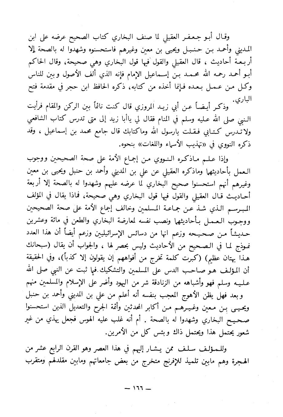 وإذا علم ما ذكره النووي من إجماع الأمة على صحة الصحيحين ووجوب العمل بأحاديثهما وما ذكره العقيلي عن علي بن المديني وأحمد بن حنبل ويحيى بن معين وغيرهم أنهم استحسنوا صحيح البخاري لما عرضه عليهم وشهدوا له بالصحة إلا أربعة أحاديث قال العقيلي والقول فيها قول البخاري وهي صحيحة, فماذا يقال في المؤلف المبرسم الذي شذ عن جماعة المسلمين وخالف إجماع الأمة على صحة الصحيحين ووجوب العمل بأحديثهما ونصب نفسه لمعارضة البخاري والطعن في مائة وعشرين حديثاً من صحيحه وزعم أنها من دسائس الإِسرائيليين وزعم أيضاً أن هذا العدد نموذج لما في الصحيح من الأحاديث وليس بحصر لها, والجواب أن يقال (سبحانك هذا بهتان عظيم) (كبرت كلمة تخرج من أفواههم إن يقولون إلا كذباً) , وفي الحقيقة أن المؤلف هو صاحب الدس على المسلمين والتشكيك. فيما ثبت عن النبي صلى الله عليه وسلم فهو وأشباهه من الزنادقة شر من اليهود وأضر على الإِسلام والمسلمين منهم وبعد فهل يظن الأهوج المعجب بنفسه أنه أعلم من علي بن المديني وأحمد بن حنبل ويحيى بن معين وغيرهم من أكابر المحدثين وأئمة الجرح والتعديل الذين استحسنوا صحيح البخاري وشهدوا له بالصحة. أم أنه غلب عليه الهوس فجعل يهذي من غير شعور يحتمل هذا ويحتمل ذاك وبئس كل من الأمرين.