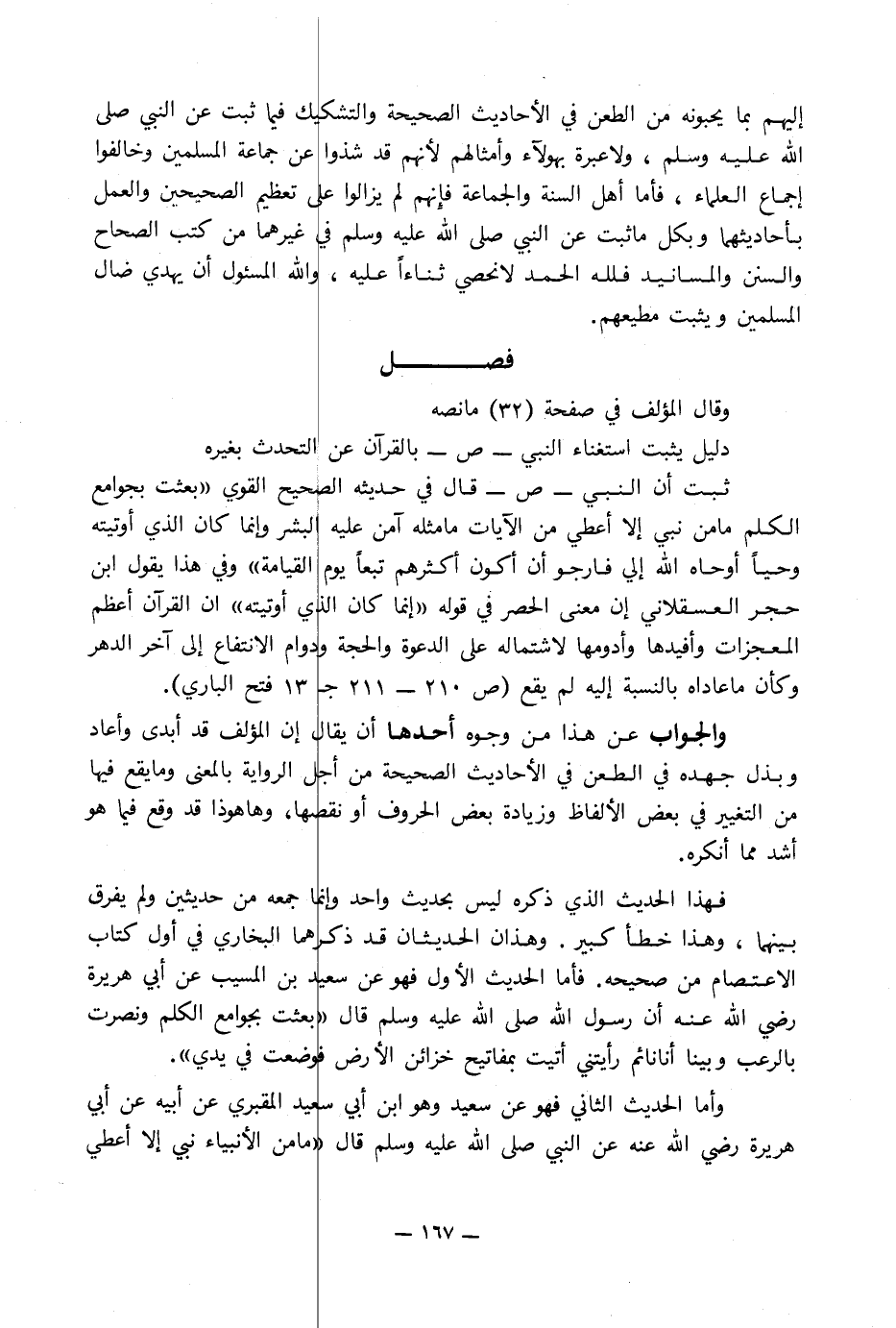 والجواب عن هذا من جوه أحدها أن يقال إن المؤلف قد أبدى وأعاد وبذل جهده في الطعن في الأحاديث الصحيحة من أجل الرواية بالمعنى وما يقع فيها من التغيير في بعض الألفاظ وزيادة بعض الحروف أو نقصها, وها هو ذا قد وقع فيما هو أشد مما أنكره.