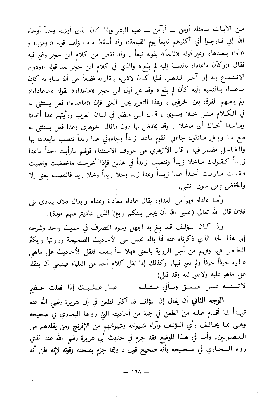 من الآيات ما مثله أومن - أو آمن - عليه البشر وإنما كان الذي أوتيته وحياً أوحاه الله إلي فأرجوا أني أكثرهم تابعاً يوم القيامة» وقد أسقط منه المؤلف قوله «أومن» و «أو» بعدها, وغير قوله «تابعاً» بقوله تبعاً. وقد نقص من كلام ابن حجر وغير فيه فقال «وكأن ما عاداه بالنسبة إليه لم يقع» والذي في كلام ابن حجر بعد قوله «ودوام الانتفاع به إلى آخر الدهر, فلما كان لا شيء يقاربه فضلاً عن أن يساويه كان ما عداه بالنسبة إليه كأن لم يقع» وقد غير قول ابن حجر «ما عداه» بقوله «ما عاداه» ولم يفهم الفرق بين الحرفين, وهذا التغيير يحيل المعنى فإِن «ما عداه» فعل يستثنى به في الكلام مثل خلا وسوى, قال ابن منظور في لسان العرب ورأيتهم عدا أخاك وما عدا أخاك أي ما خلا. وقد يخفض بها دون ما قال الجوهري وعدا فعل يستثنى به مع ما وبغير ما تقول جاءني القوم ما عدا زيداً وجاءوني عدا زيداً تنصب ما بعدها بها والفاعل مضمر فيها, قال الأزهري من حروف الاستثناء قولهم ما رأيت أحداً ما عدا زيداً كقولك ما خلا زيداً وتنصب زيداً في هذين فإِذا أخرجت ما خفضت ونصبت فقلت ما رأيت أحداً عدا زيداً وعدا زيد وخلا زيداً وخلا زيد فالنصب بمعنى إلا والخفض بمعنى سوى انتهى.