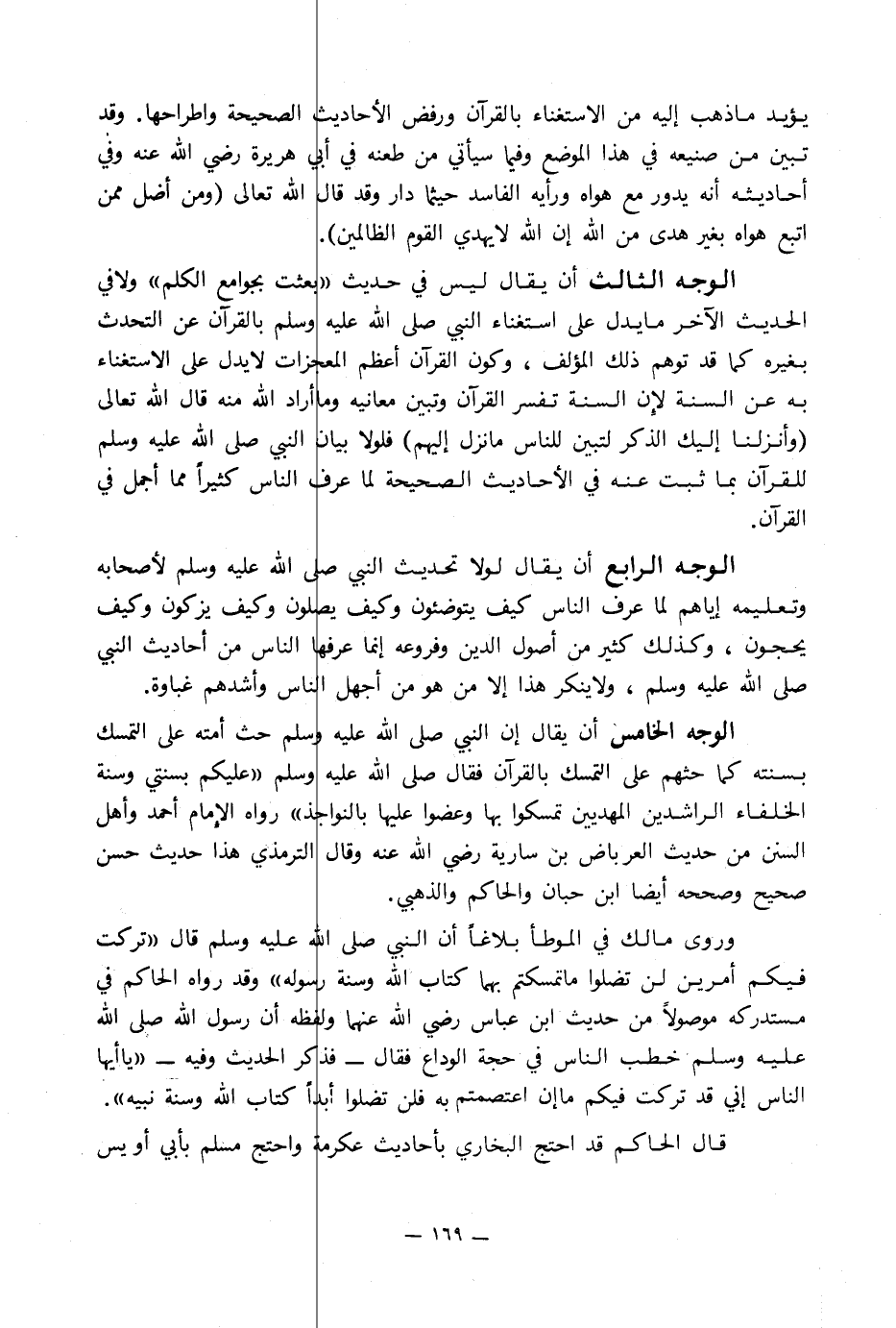 الوجه الخامس أن يقال إن النبي صلى الله عليه وسلم حث أمته على التمسك بسنته كما حثهم على التمسك بالقرآن فقال صلى الله عليه وسلم «عليكم بسنتي وسنة الخلفاء الراشدين المهديين تمسكوا بها وعضوا عليها بالنواجذ» رواه الإِمام أحمد وأهل السنن من حديث العرباض بن سارية رضي الله عنه وقال الترمذي هذا حديث حسن صحيح وصححه أيضا ابن حبان والحاكم والذهبي.