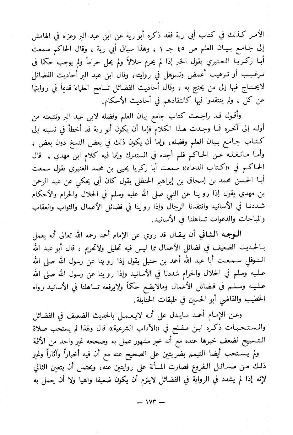 الأمر كذلك في كتاب أبي رية فقد ذكره أبو رية عن ابن عبد البر وعزاه في الهامش إلى جامع بيان العلم ص 45 جـ 1, وهذا سياق أبي رية, وقال الحاكم سمعت أبا زكريا العنبري يقول الخبر إذا لم يحرم حلالاً ولم يحل حراماً ولم يوجب حكما في ترغيب أو ترهيب أغمض وتسوهل في روايته, وقال ابن عبد البر أحاديث الفضائل لا يحتاج فيها إلى من يحتج به, وقال أحاديث الفضائل تسامح العلماء قديماً في روايتها عن كل, ولم ينتقدوا فيها كانتقادهم في أحاديث الأحكام.