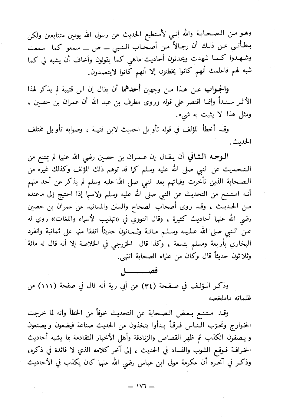 والجواب عن هذا من وجهين أحدهما أن يقال إن ابن قتيبة لم يذكر لهذا الأثر سنداً وإنما اقتصر على قوله وروى مطرف بن عبد الله أن عمران بن حصين, ومثل هذا لا يثبت به شيء.