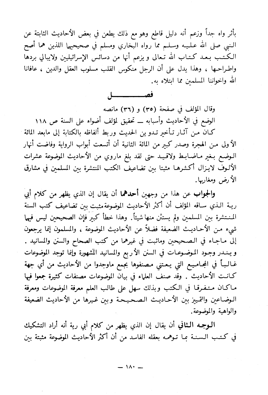 والجواب عن هذا من وجهين أحدهما أن يقال إن الذي يظهر من كلام أبي رية الذي ساقه المؤلف أن أكثر الأحاديث الموضوعة مثبت بين تضاعيف كتب السنة المنتشرة بين المسلمين ولم يستثن منها شيئاً. وهذا خطأ كبير فإِن الصحيحين ليس فيهما شيء من الأحاديث الضعيفة فضلاً عن الأحاديث الموضوعة, والمسلمون إنما يرجعون إلى ما جاء في الصحيحين وما ثبت في غيرهما من كتب الصحاح والسنن والمسانيد.