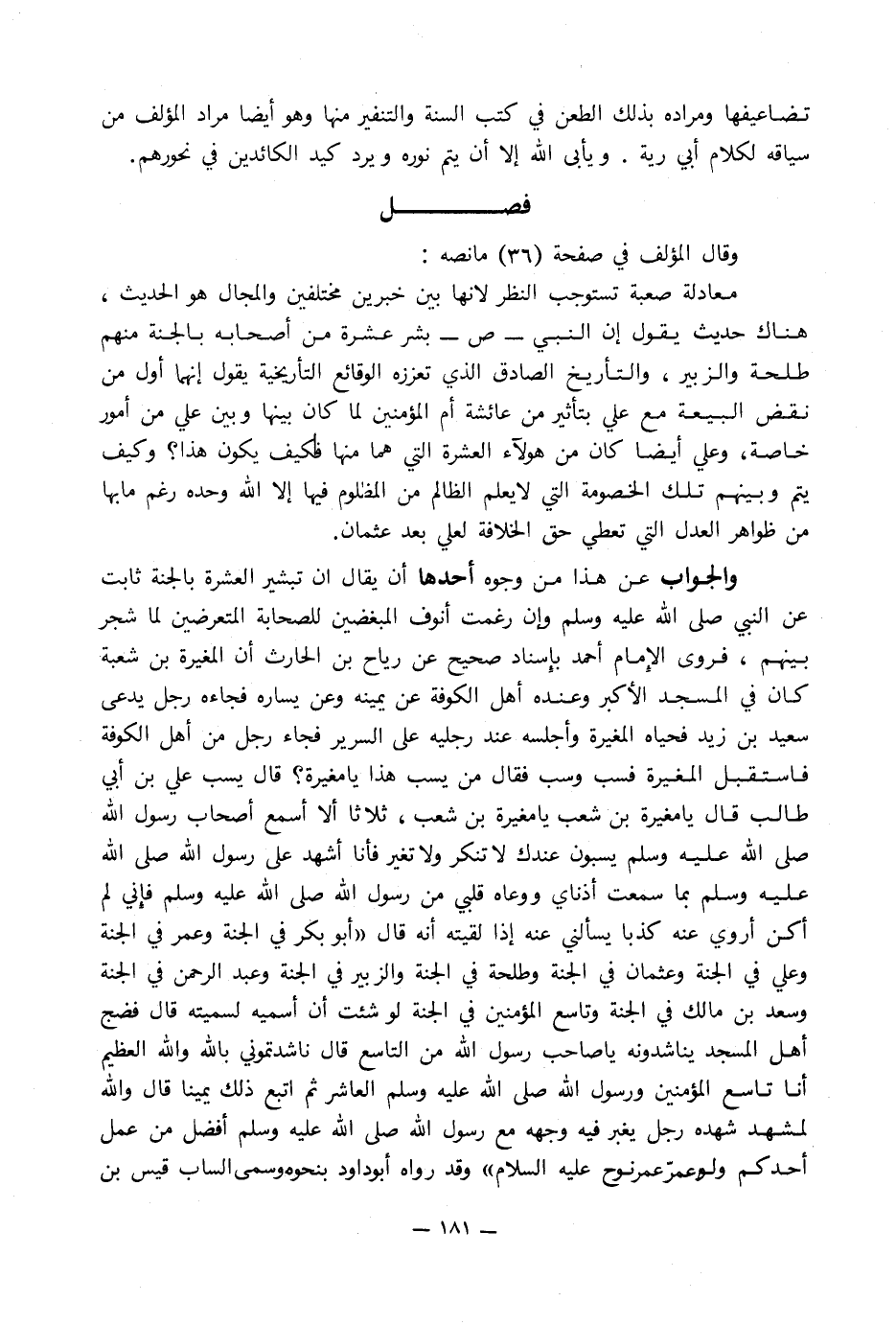 والجواب عن هذا من وجوه أحدها أن يقال إن تبشير العشرة بالجنة ثابت عن النبي صلى الله عليه وسلم وإن رغمت أنوف المبغضين للصحابة المتعرضين لما شجر بينهم, فروى الإِمام أحمد بإِسناد صحيح عن رياح بن الحارث أن المغيرة بن شعبة كان في المسجد الأكبر وعنده أهل الكوفة عن يمينه وعن يساره فجاءه رجل يدعى سعيد بن زيد فحياه المغيرة وأجلسه عند رجليه على السرير فجاء رجل من أهل الكوفة فاستقبل المغيرة فسب وسب فقال من يسب هذا يا مغيرة؟ قال يسب علي بن أبي طالب قال يا مغيرة بن شعب يا مغيرة بن شعب, ثلاثا ألا أسمع أصحاب رسول الله صلى الله عليه وسلم يسبون عندك لا تنكر ولا تغير فأنا أشهد على رسول الله صلى الله عليه وسلم بما سمعت أذناي ووعاه قلبي من رسول الله صلى الله عليه وسلم فإِني لم أكن أروي عنه كذبا يسألني عنه إذا لقيته أنه قال «أبو بكر في الجنة وعمر في الجنة وعلي في الجنة وعثمان في الجنة وطلحة في الجنة والزبير في الجنة وعبد الرحمن في الجنة وسعد بن مالك في الجنة وتاسع المؤمنين في الجنة لو شئت أن أسميه لسميته قال فضج أهل المسجد يناشدونه يا صاحب رسول الله من التاسع قال ناشدتموني بالله والله العظيم أنا تاسع المؤمنين ورسول الله صلى الله عليه وسلم العاشر ثم أتبع ذلك يمينا قال والله لمشهد شهده رجل يغبر فيه وجهه مع رسول الله صلى الله عليه وسلم أفضل من عمل أحدكم ولو عمّر عمر نوح عليه السلام» وقد رواه أبو داود بنحوه وسمى الساب قيس بن
