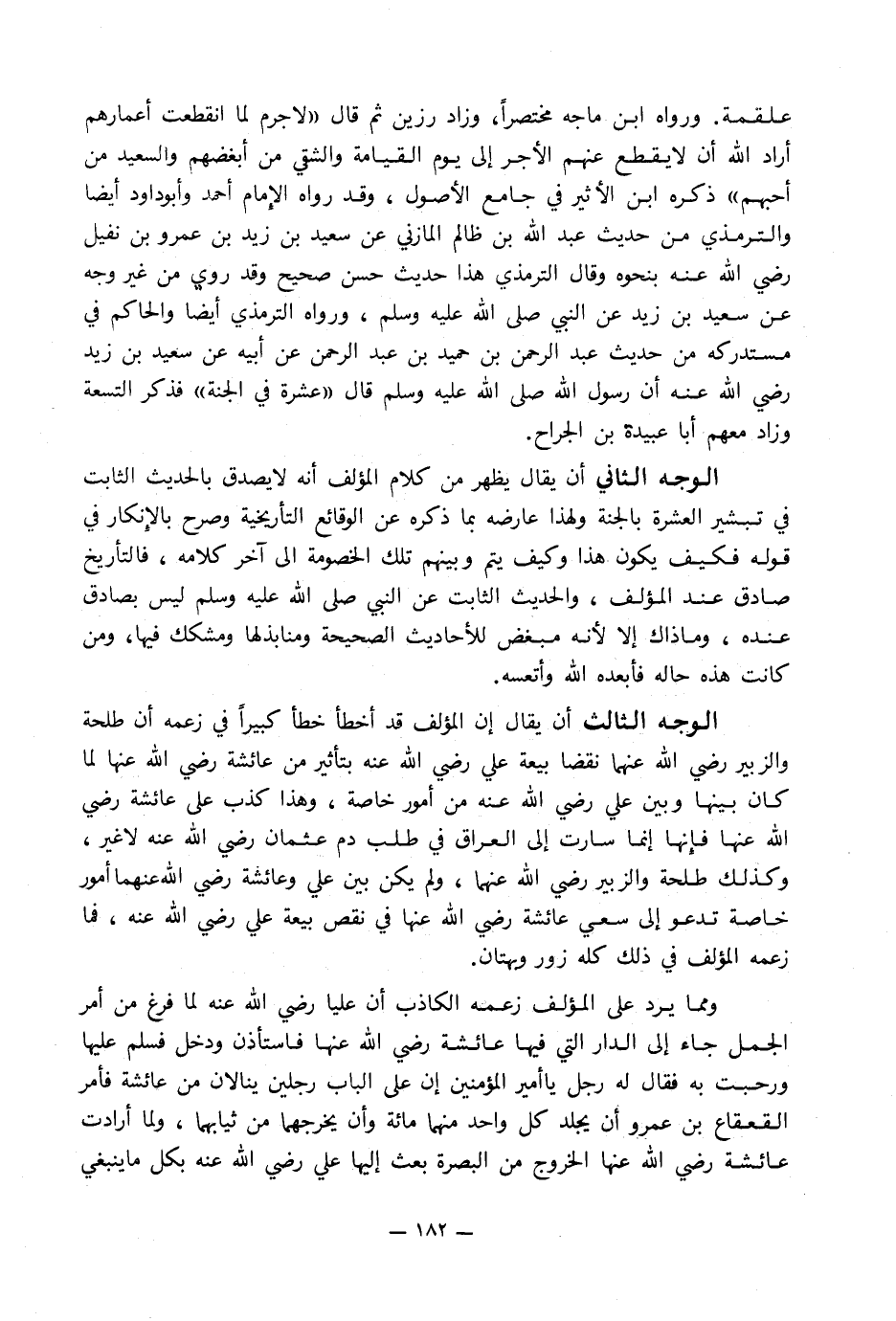 الوجه الثاني أن يقال يظهر من كلام المؤلف أنه لا يصدق بالحديث الثابت في تبشير العشرة بالجنة ولهذا عارضه بما ذكره عن الوقائع التأريخية وصرح بالإِنكار في قوله فكيف يكون هذا وكيف يتم وبينهم تلك الخصومة إلى آخر كلامه, فالتأريخ صادق عند المؤلف, والحديث الثابت عن النبي صلى الله عليه وسلم ليس بصادق عنده, وما ذاك إلا لأنه مبغض للأحاديث الصحيحة ومنابذها ومشكك فيها, ومن كانت هذه حاله فأبعده الله وأتعسه.