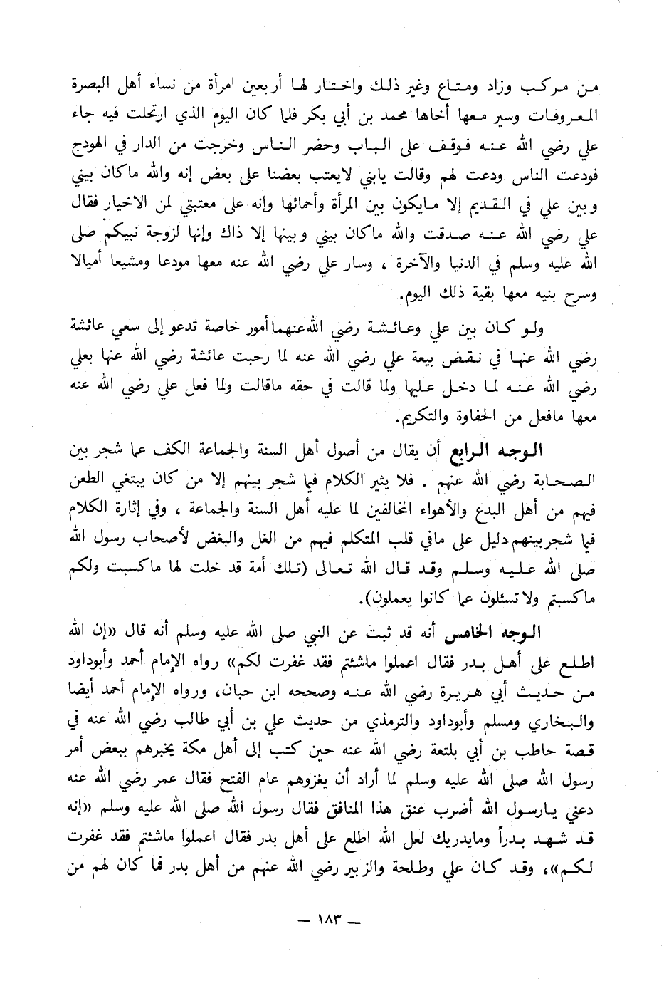 الوجه الرابع أن يقال من أصول أهل السنة والجماعة الكف عما شجر بين الصحابة رضي الله عنهم. فلا يثير الكلام فيما شجر بينهم إلا من كان يبتغي الطعن فيهم من أهل البدع والأهواء المخالفين لما عليه أهل السنة والجماعة, وفي إثارة الكلام فيما شجر بينهم دليل على ما في قلب المتكلم فيهم من الغل والبغض لأصحاب رسول الله صلى الله عليه وسلم وقد قال الله تعالى (تلك أمة قد خلت لها ما كسبت ولكم ما كسبتم ولا تسئلون عما كانوا يعملون).