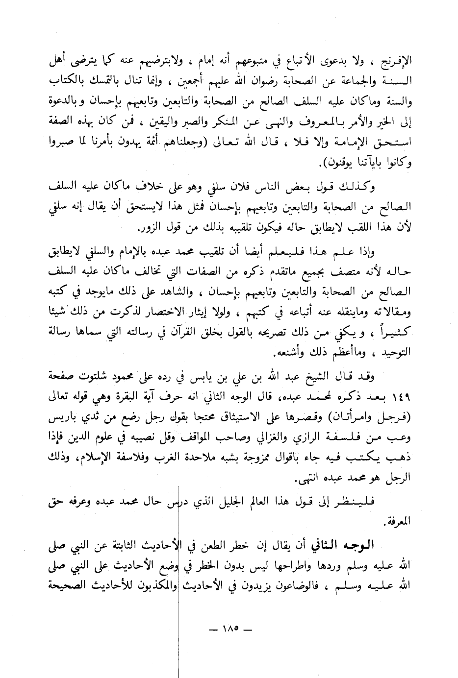الإِفرنج, ولا بدعوى الأتباع في متبوعهم أنه إمام, ولا بترضيهم عنه كما يترضى أهل السنة والجماعة عن الصحابة رضوان الله عليهم أجمعين, وإنما تنال بالتمسك بالكتاب والسنة وما كان عليه السلف الصالح من الصحابة والتابعين وتابعيهم بإِحسان وبالدعوة إلى الخير والأمر بالمعروف والنهي عن المنكر والصبر واليقين, فمن كان بهذه الصفة استحق الإِمامة وإلا فلا, قال الله تعالى (وجعلناهم أئمة يهدون بأمرنا لما صبروا وكانوا بآياتنا يوقنون).