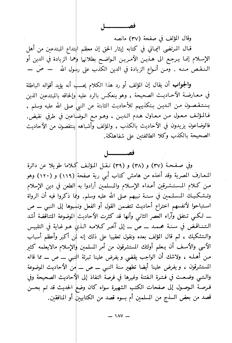 وفي صفحة (37) و (38) و (39) نقل المؤلف كلاما طويلا عن دائرة المعارف المصرية وقد أخذه من هامش كتاب أبي رية صفحة (119) و (120) وهو من كلام المستشرقين أعداء الإِسلام والمسلمين أرادوا به الطعن في دين الإِسلام وتشكيك المسلمين في سنة نبيهم صلى الله عليه وسلم. ومما ذكروا فيه أن الرواة استباحوا لأنفسهم اختراع أحاديث تتضمن القول أو الفعل ونسبوها إلى النبي - ص - لكي تتفق وآراء العصر الثاني وأنها قد كثرت الأحاديث الموضوعة المتناقضة أشد التناقض في سنة محمد - ص - إلى آخر كلامه الذي هو غاية في التلبيس والتشكيك, ثم قال المؤلف بعده ونقول تعقيبا على ذلك إنه لمن أكبر وأعظم أسباب الأسى والأسف أن يعلم أولئك المستشرقون من أمر المسلمين والإِسلام ما لا يعلمه كثير من أهله, ولا شك أن الواجب يقضي ويفرض علينا تبرئة النبي - ص - مما قاله المستشرقون, ويفرض علينا أيضا تطهير سنة النبي - ص - من الأحاديث الموضوعة والتي وضعت في فترة الفتنة وغيرها في فرصة النفاذ إلى الأحاديث الصحيحة وفي فرصة الوصول إلى صفحات الكتب الشهيرة سواء كان وضع الحديث قد تم بحسن قصد من بعض السذج من المسلمين أم بسوء قصد من الكتابيين أو المنافقين.