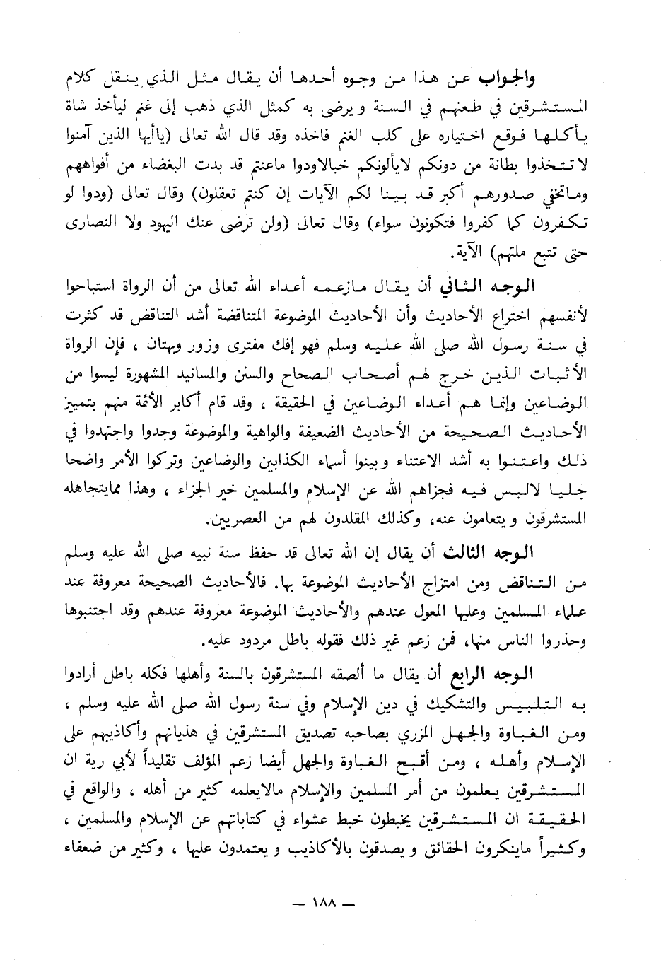 الوجه الرابع أن يقال ما ألصقه المستشرقون بالسنة وأهلها فكله باطل أرادوا به التلبيس والتشكيك في دين الإِسلام وفي سنة رسول الله صلى الله عليه وسلم, ومن الغباوة والجهل المزري بصاحبه تصديق المستشرقين في هذيانهم وأكاذيبهم على الإِسلام وأهله, ومن أقبح الغباوة والجهل أيضا زعم المؤلف تقليداً لأبي رية أن المستشرقين يعلمون من أمر المسلمين والإِسلام ما لا يعلمه كثير من أهله, والواقع في الحقيقة أن المستشرقين يخبطون خبط عشواء في كتاباتهم عن الإِسلام والمسلمين, وكثيراً ما ينكرون الحقائق ويصدقون بالأكاذيب ويعتمدون عليها, وكثير من ضعفاء